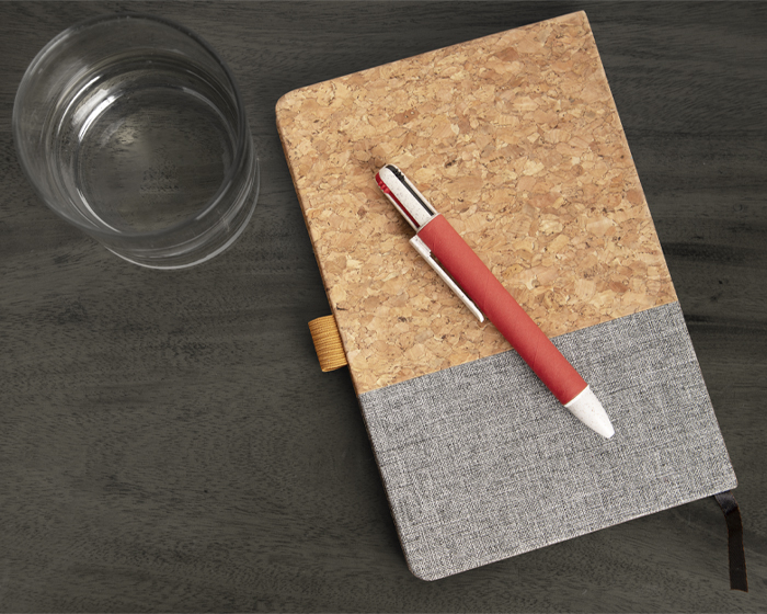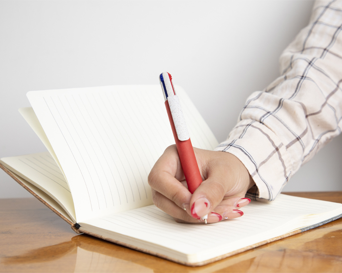 SPEARS - Bolígrafo ecológico multifunción con 4 colores diferentes de tinta: negro, azul, verde y rojo; mecanismo de click con cuerpo de papel; punta, clip y parte superior de fibra de trigo.