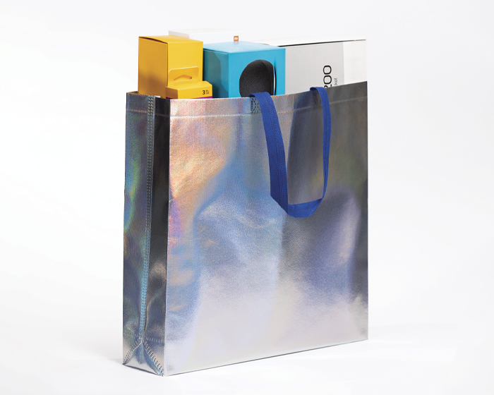 SHINE - Bolsa tornasol de Non Woven de 100 grs. termosellada, con fuelle y asas de color.