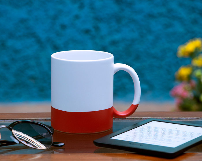 GRES - Tarro blanco mate de arcilla para sublimación, con base y media asa de color. CAP. 325 ml. (11 OZ).