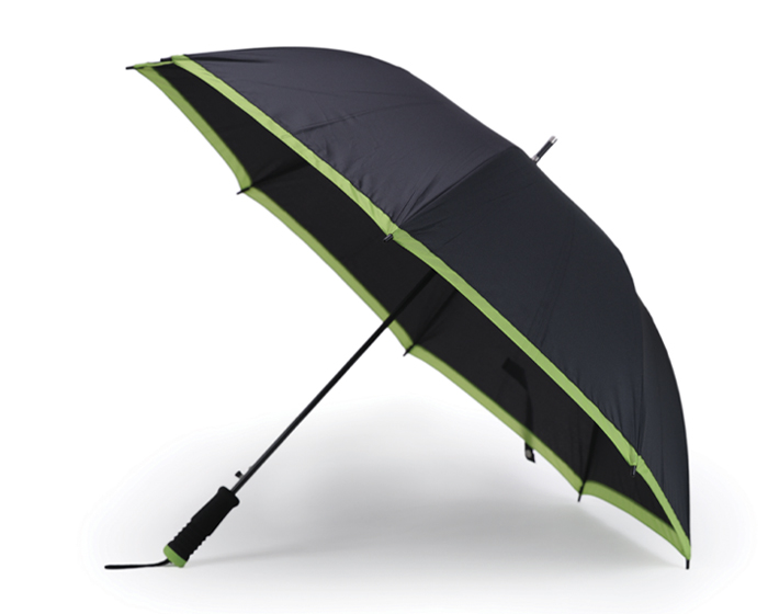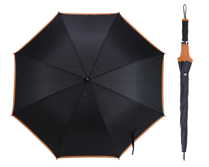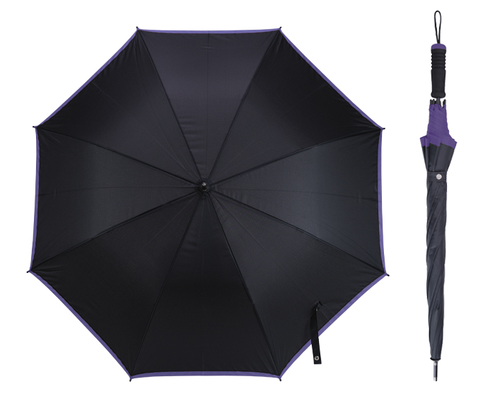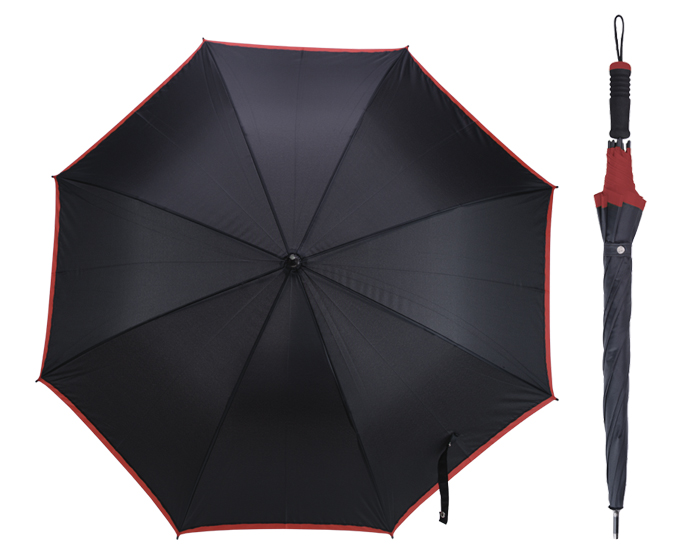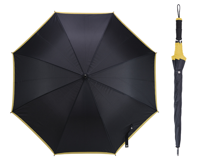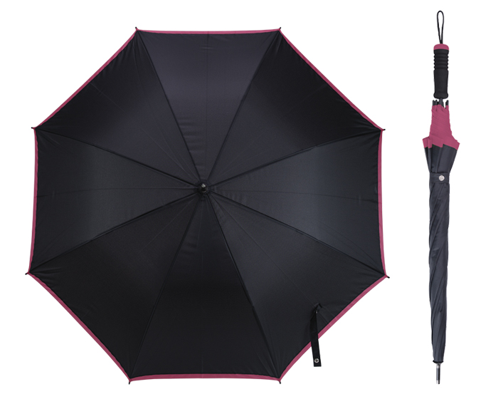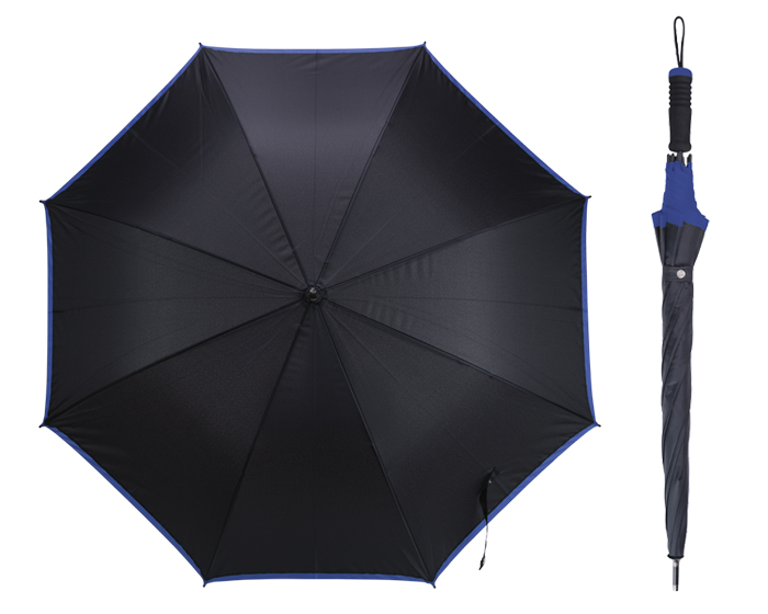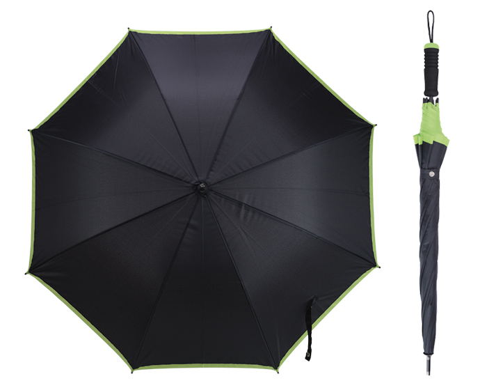 ANNY - Paraguas de 8 gajos con botón de apertura automático, varillas y eje de fibra de vidrio. Cuenta con cintillo para guardar, orilla de color en los gajos, mango EVA con punta de color y cordón para transportar.