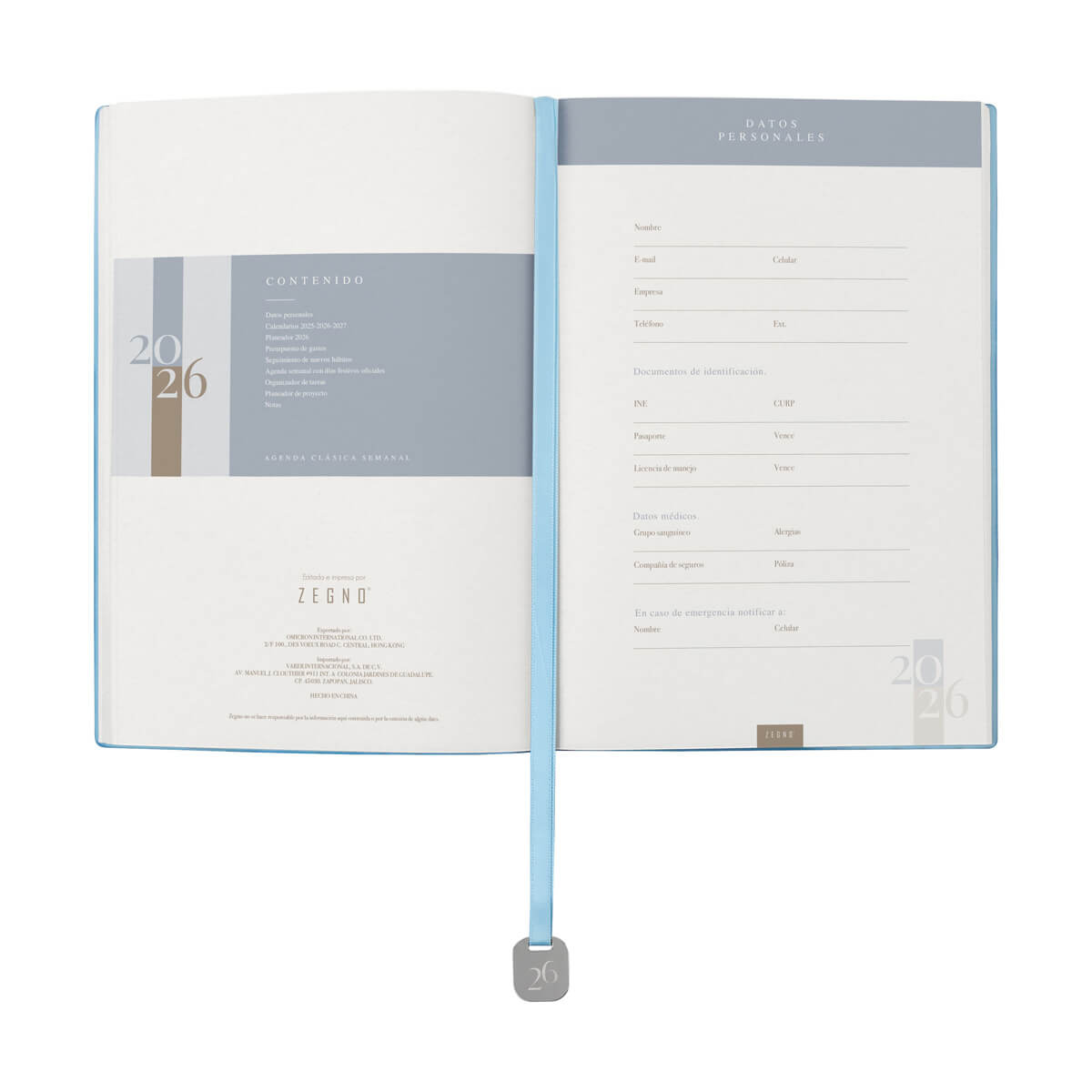 AGENDA SEMANAL CLÁSICA 2026 - Agenda semanal con 100 hojas. Contiene datos personales, calendarios 2025-2026-2027, planeador 2026, presupuesto de gastos, seguimiento de nuevos hábitos, organizador de tareas, planeador de proyectos y días festivos. Incluye caja individual del mismo color a la agenda, separador con placa metálica y bolígrafo.