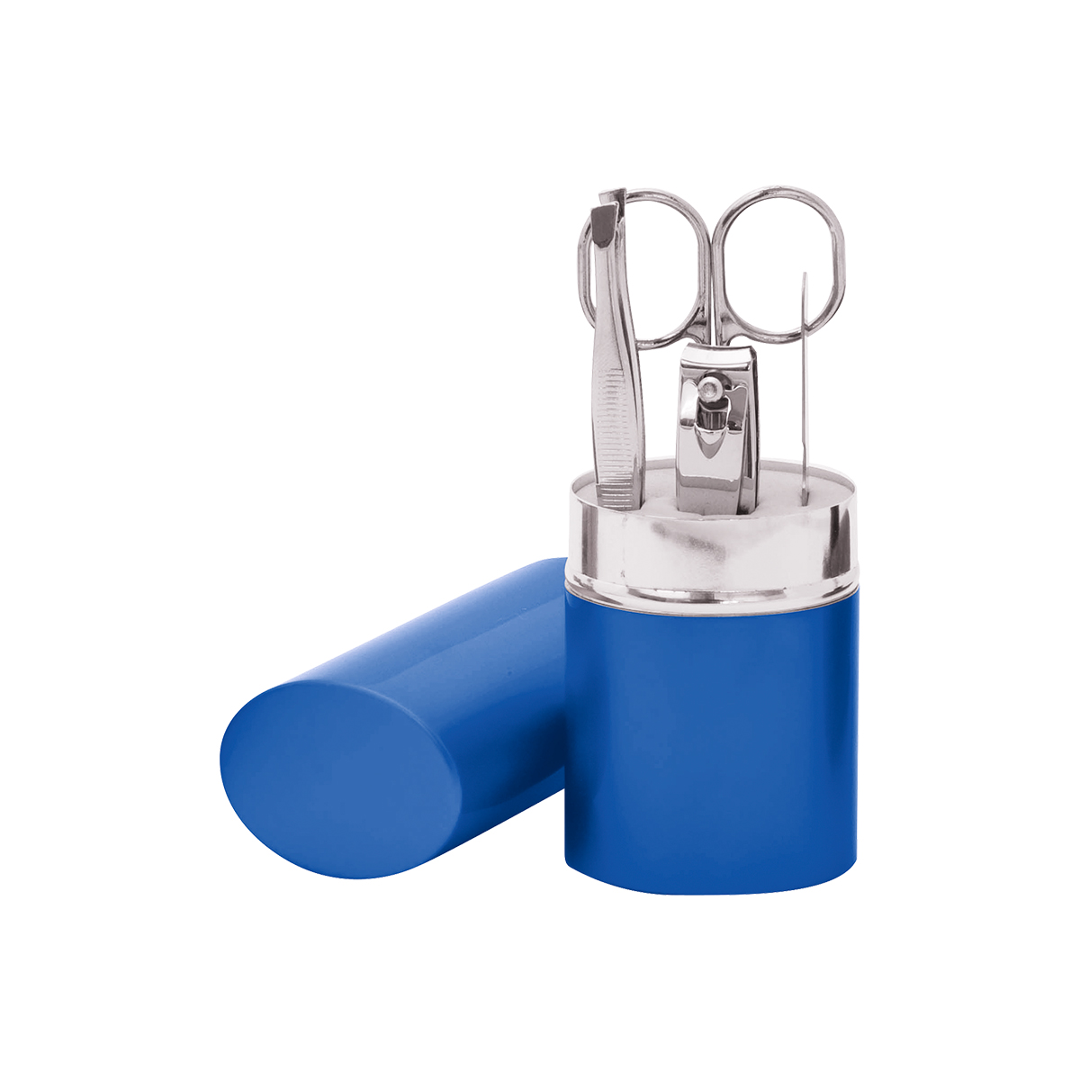 Set de manicura ovalado. - Set de manicura en estuche ovalado de metal, con 4 piezas (cortaúñas, lima de metal, pinzas para cutículas y tijeras).