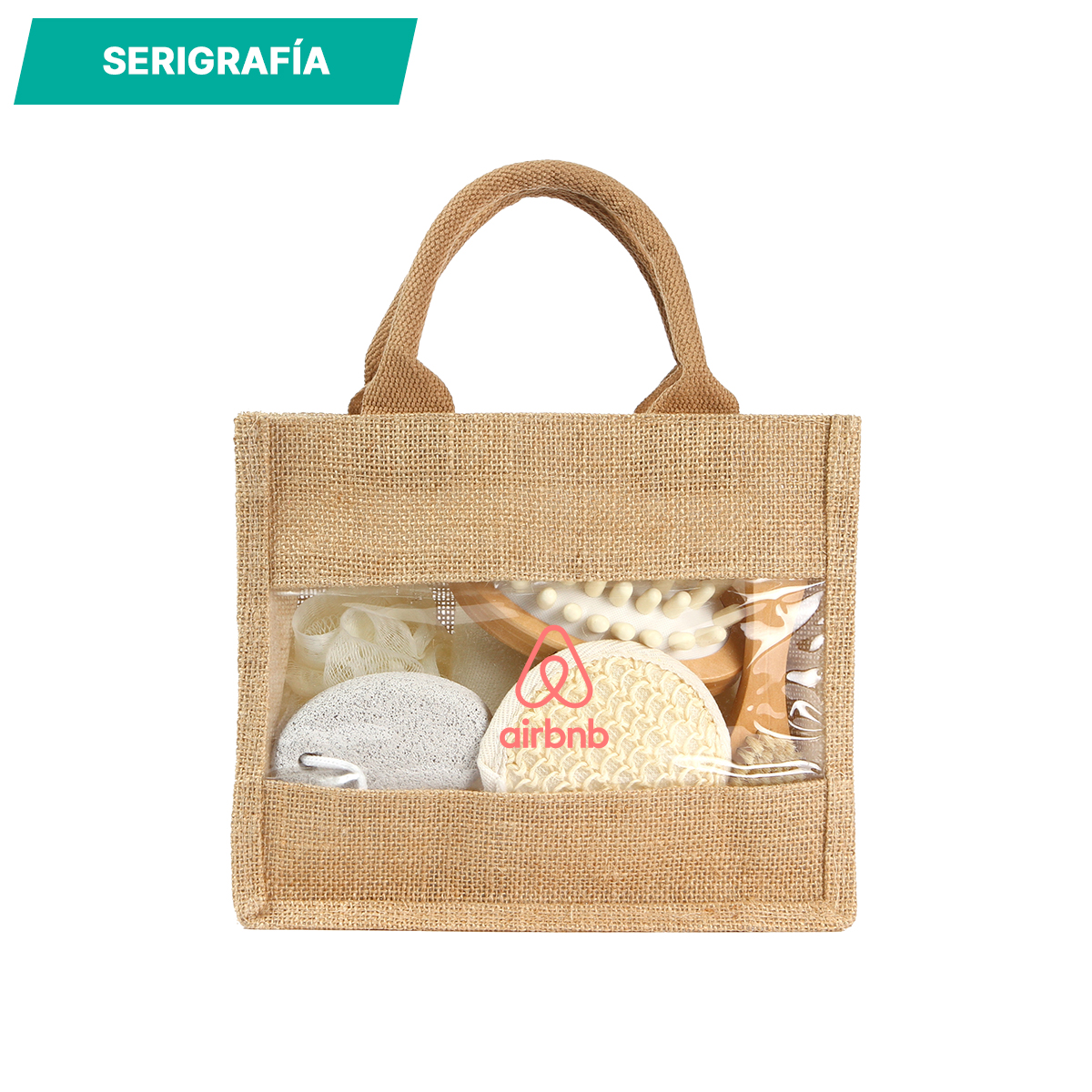 MATERIAL: YUTE, PLÁSTICO, MADERA, TELA MEDIDAS: Bolsa: 25x20x9 cm. IMPRESION: Serigrafía MED. EMPAQUE: 61x51x55 PESO EMPAQUE: 14.4 kg. PIEZAS EMPAQUE: 36