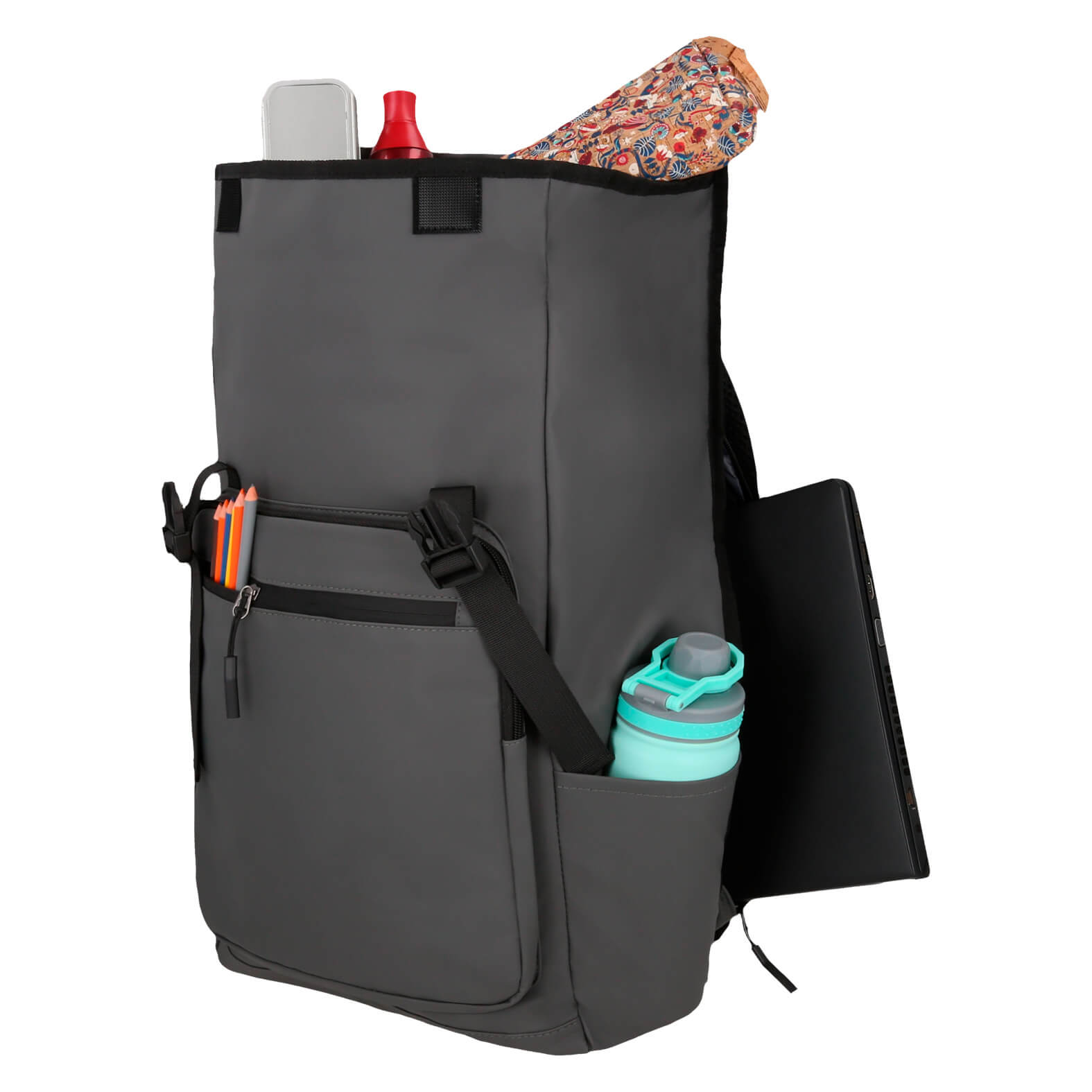 LAOS Mochila extensible enrollable con 1 compartimento principal de doble acceso, 1 bolsa interna de malla con cierre, porta laptop, doble broche, 2 compartimentos frontales de cierre, 2 bolsas laterales, carry on, tirantes acojinados y asa superior.