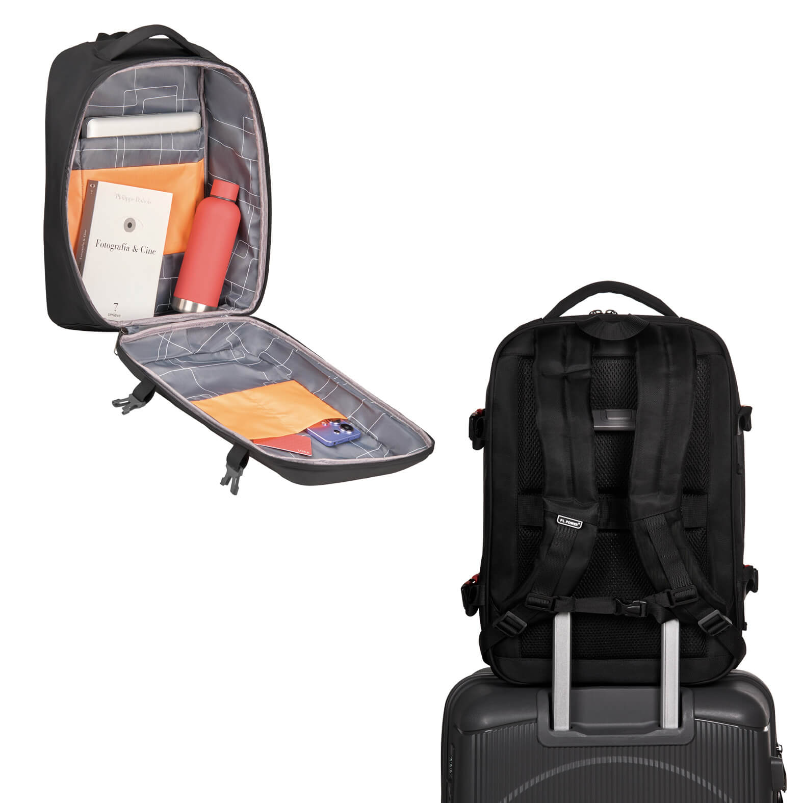 FREYA Mochila de carcasa dura con abertura 360, porta laptop de 17.5", placa, organizadores internos, cuatro broches laterales ajustables, tirantes con broche, respaldo acolchado y cinta carry-on.