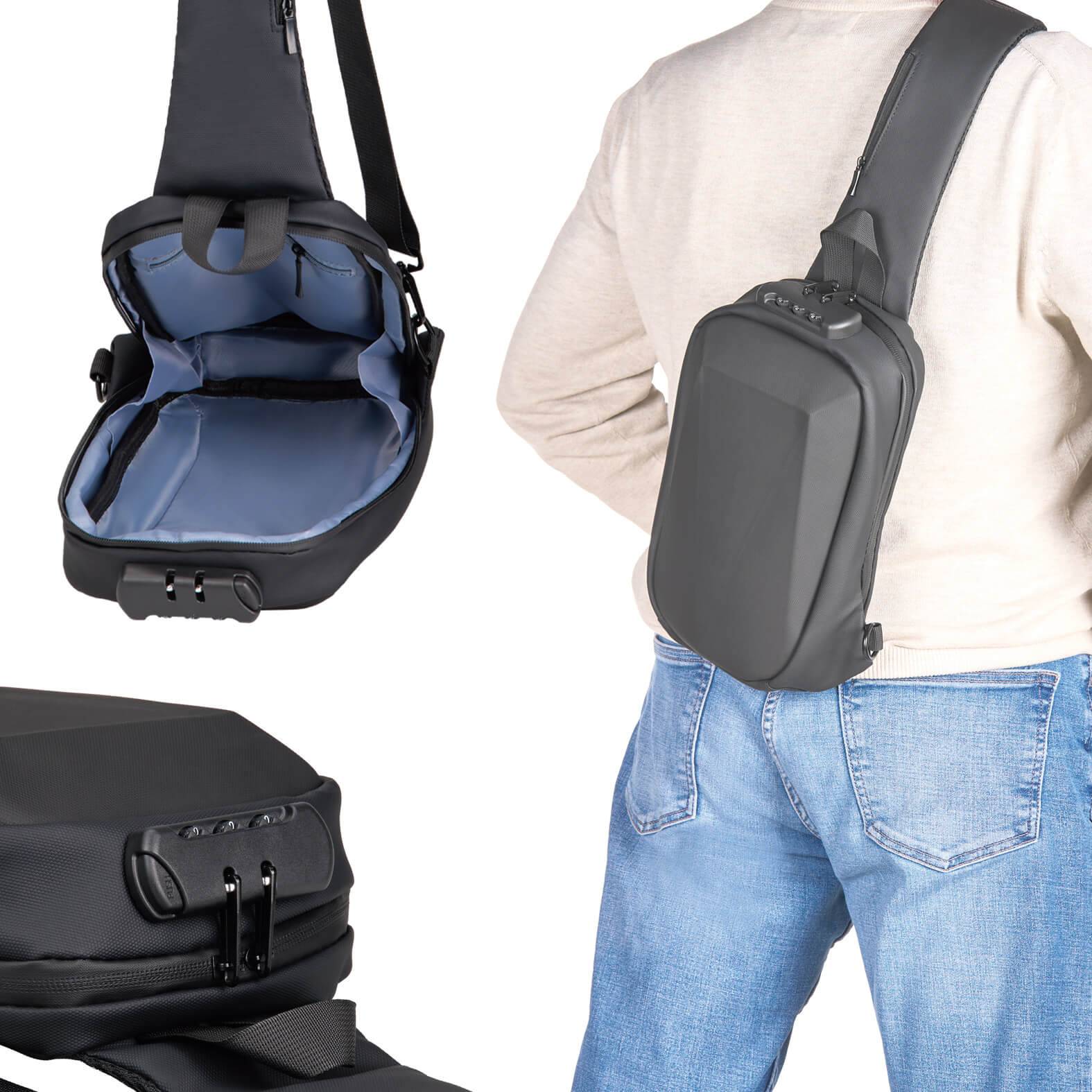 BOGUE Bolsa de hombro con carcasa dura, apertura 360°, candado de seguridad, bolsillo trasero con cierre y correa ajustable con bolsillo en el tirante.