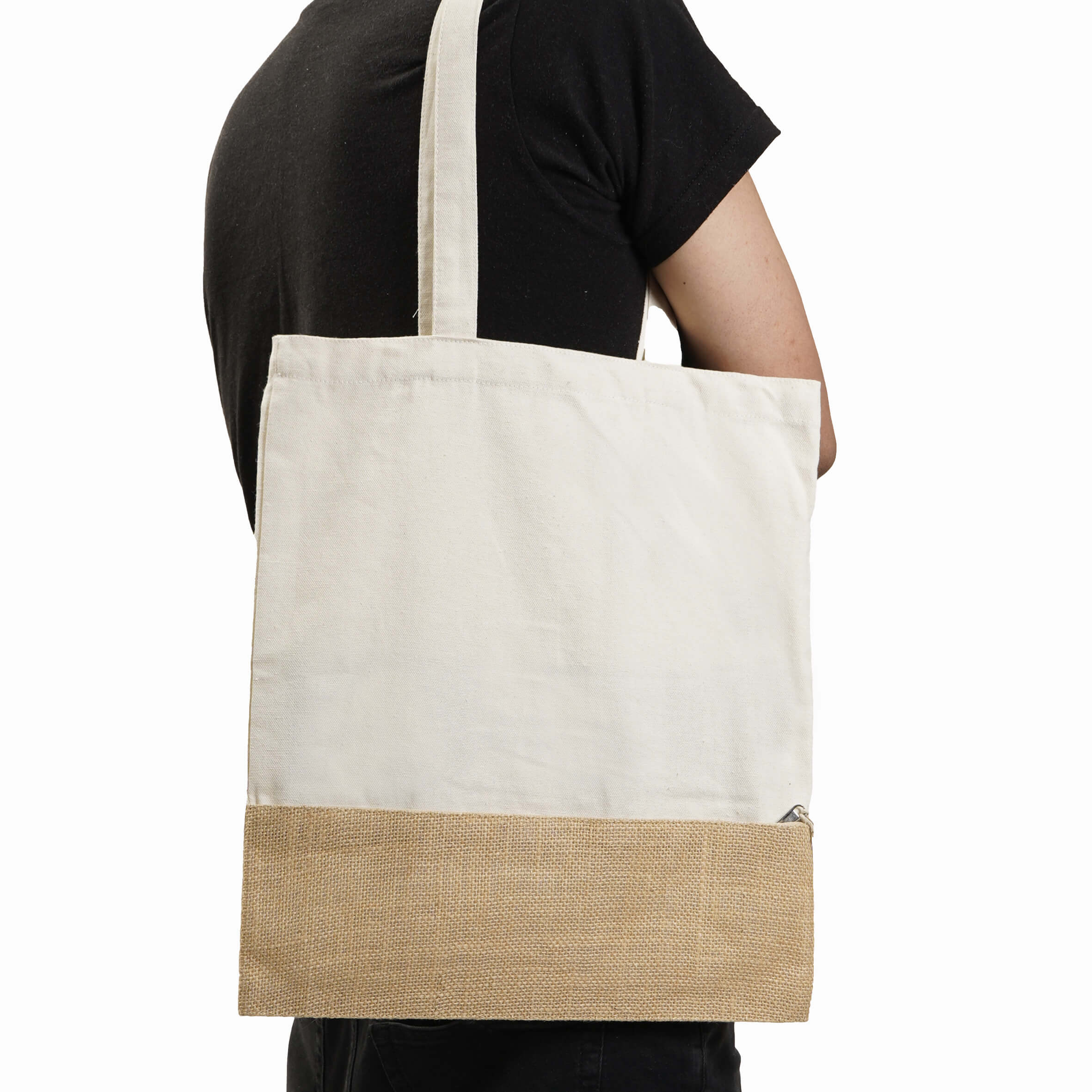 MANCORA Bolsa de algodón de 220 g/m², cosida, con compartimento principal, bolsa interna y asas resistentes. En la parte inferior cuenta con una bolsa adicional de yute con cierre.