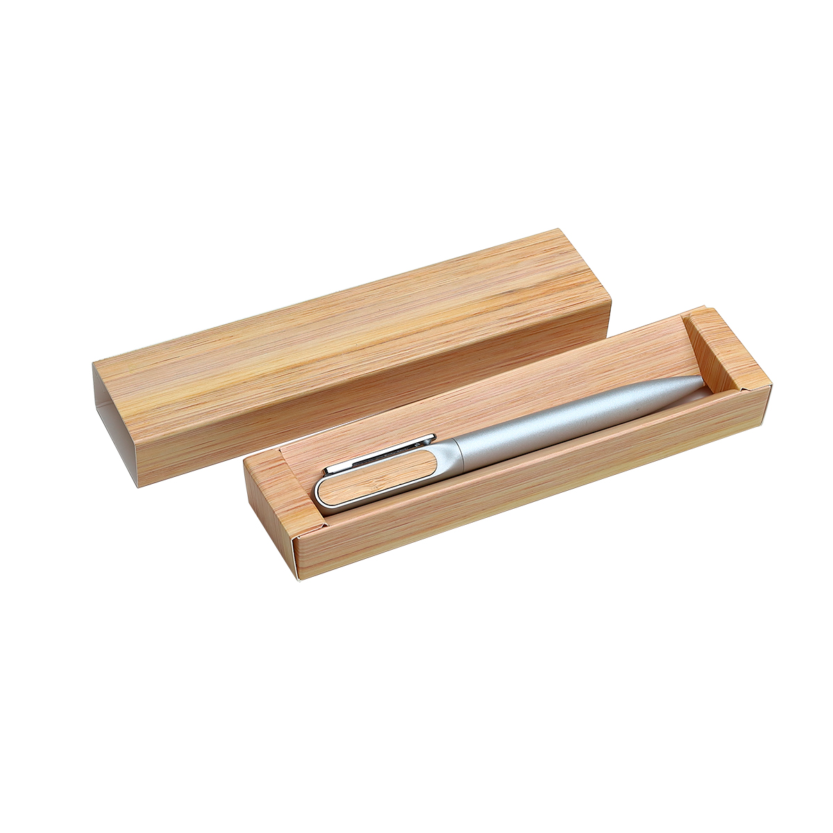 Bolígrafo Breslavia. - Bolígrafo con barril de aluminio acabado mate y detalle superior en bambú. Tinta de escritura negra. Incluye caja de cartón individual con apariencia bambú.
