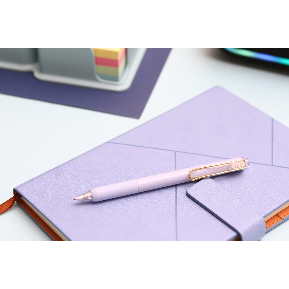 Bolígrafo Sciacca. - Bolígrafo con acción de empuje, fabricado en plástico de color sólido con detalles en color dorado. Con tinta en gel color negro, distancia de escritura de tinta de gel: 300M-400M.