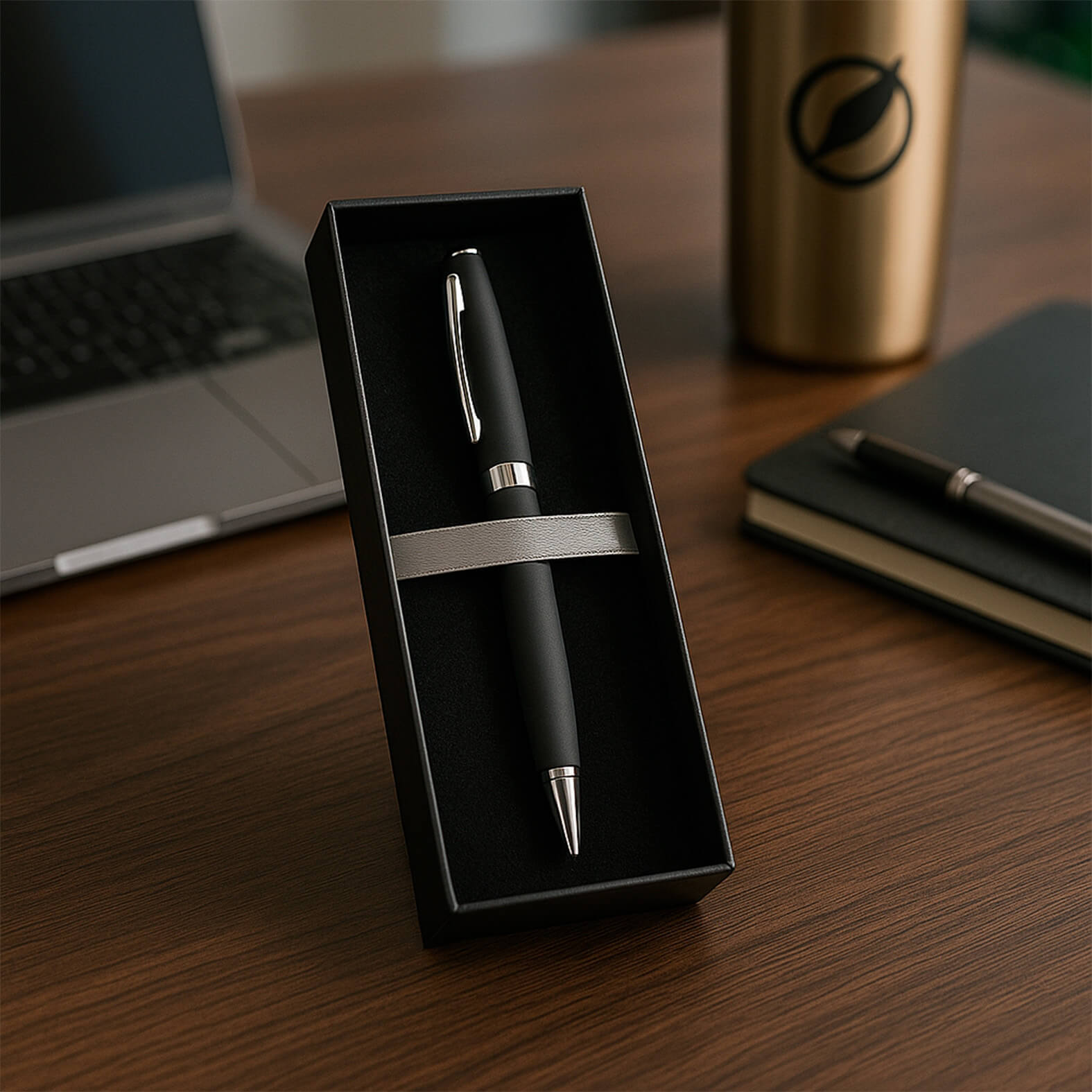 GALIA Bolígrafo metálico con acabado rubber, clip y mecanismo retráctil. Incluye caja.