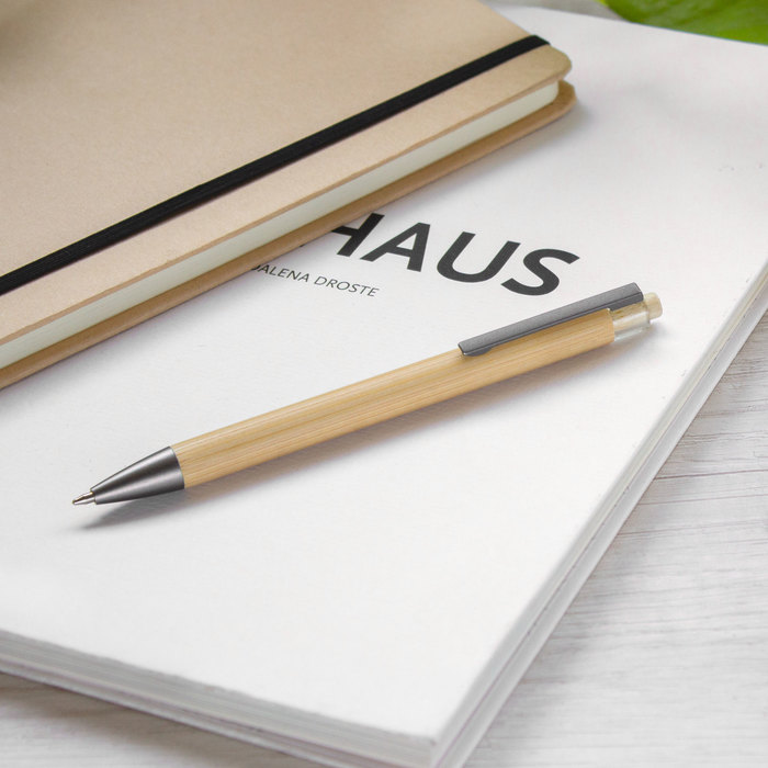 DALIA Bolígrafo de bambú con clip, grip de goma, mecanismo de click y goma tou...