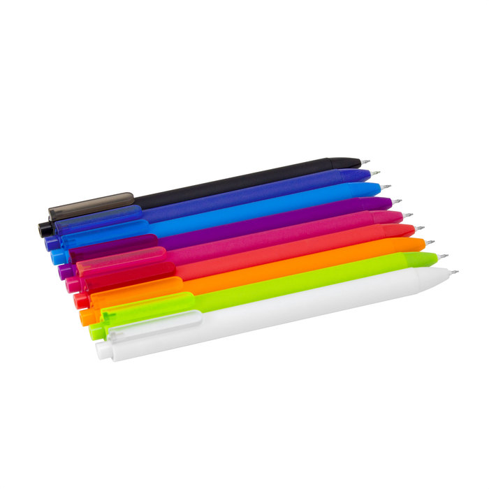 Bolígrafo "PLAIN" Bolígrafo retráctil con tinta gel. Cuerpo de diferentes colores con acabado mate suave al tacto. Pulsador y puntera del mismo color del cuerpo acabado brillante. Clip translúcido del mismo color del cuerpo.