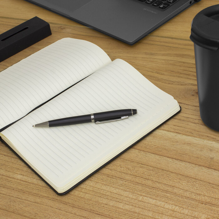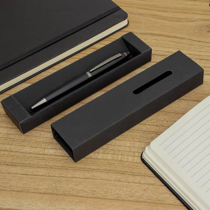 Bolígrafo "ZEPPELIN" Bolígrafo con apertura giratoria. Cuerpo de acero inoxidable de color con acabado mate. Clip, anillos y punteras metálicos color gun. Destape ocre claro. Recarga Parker Jumbo metálico