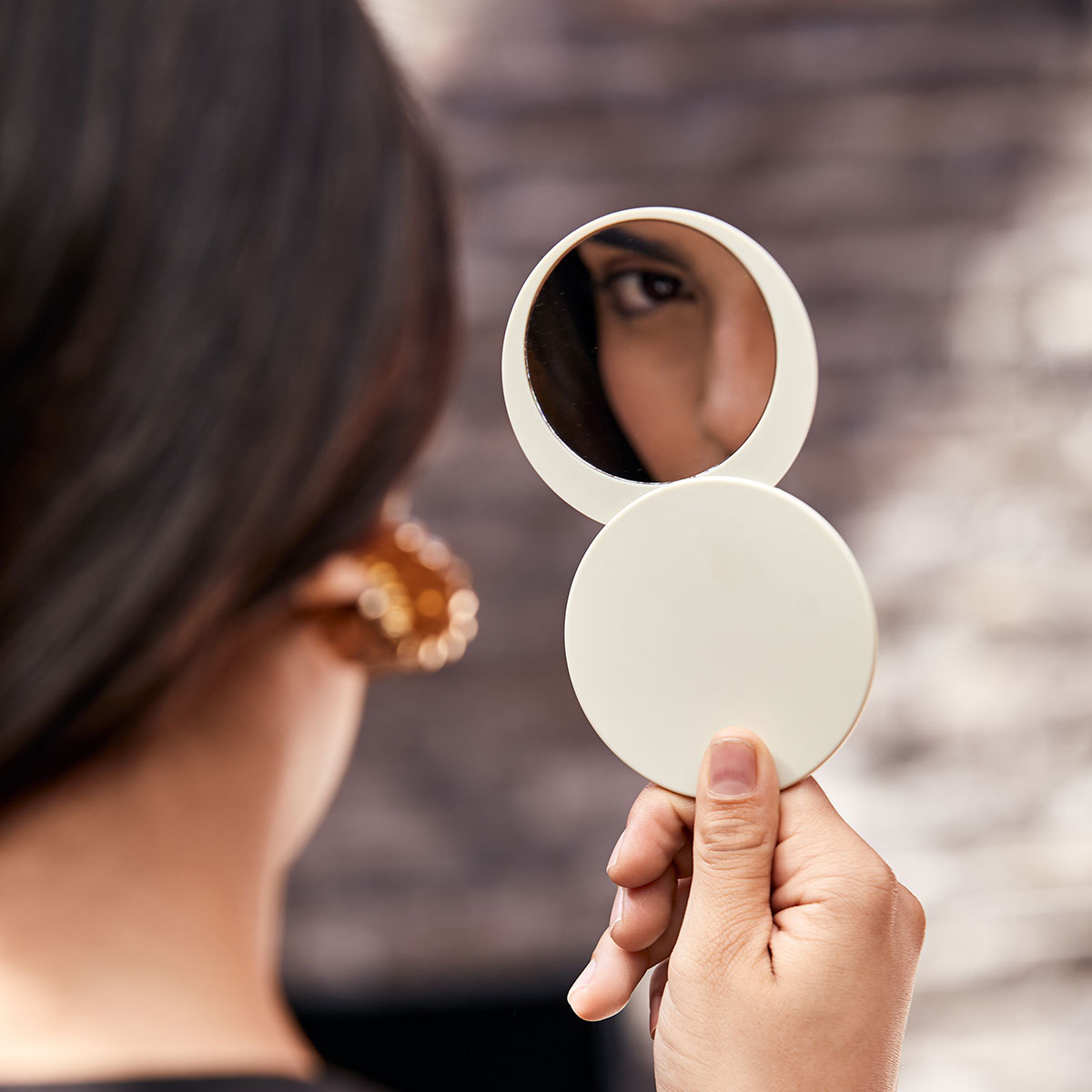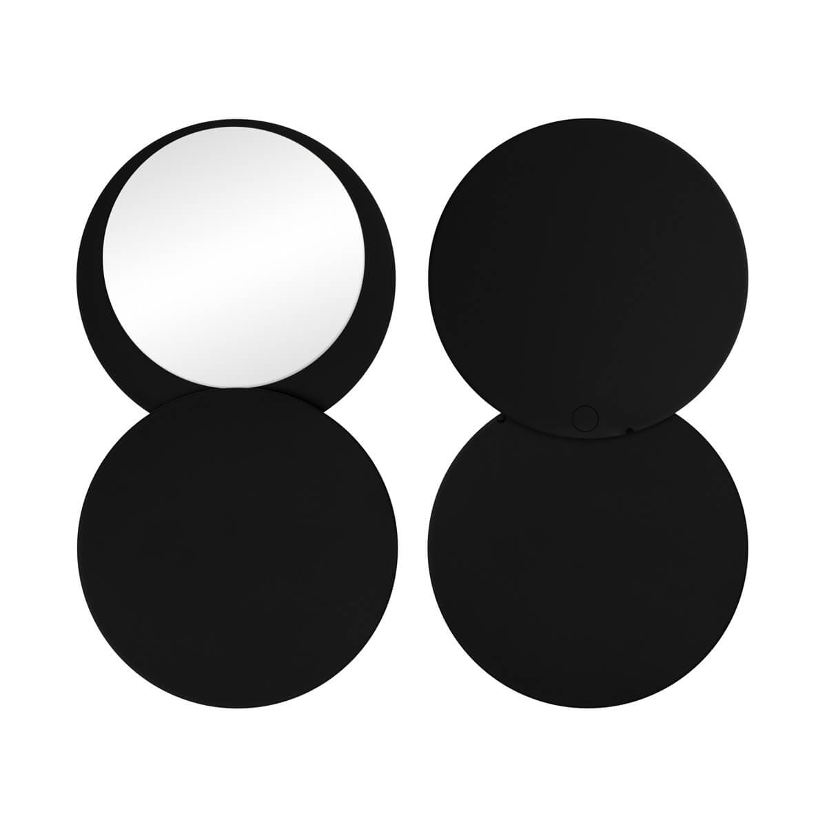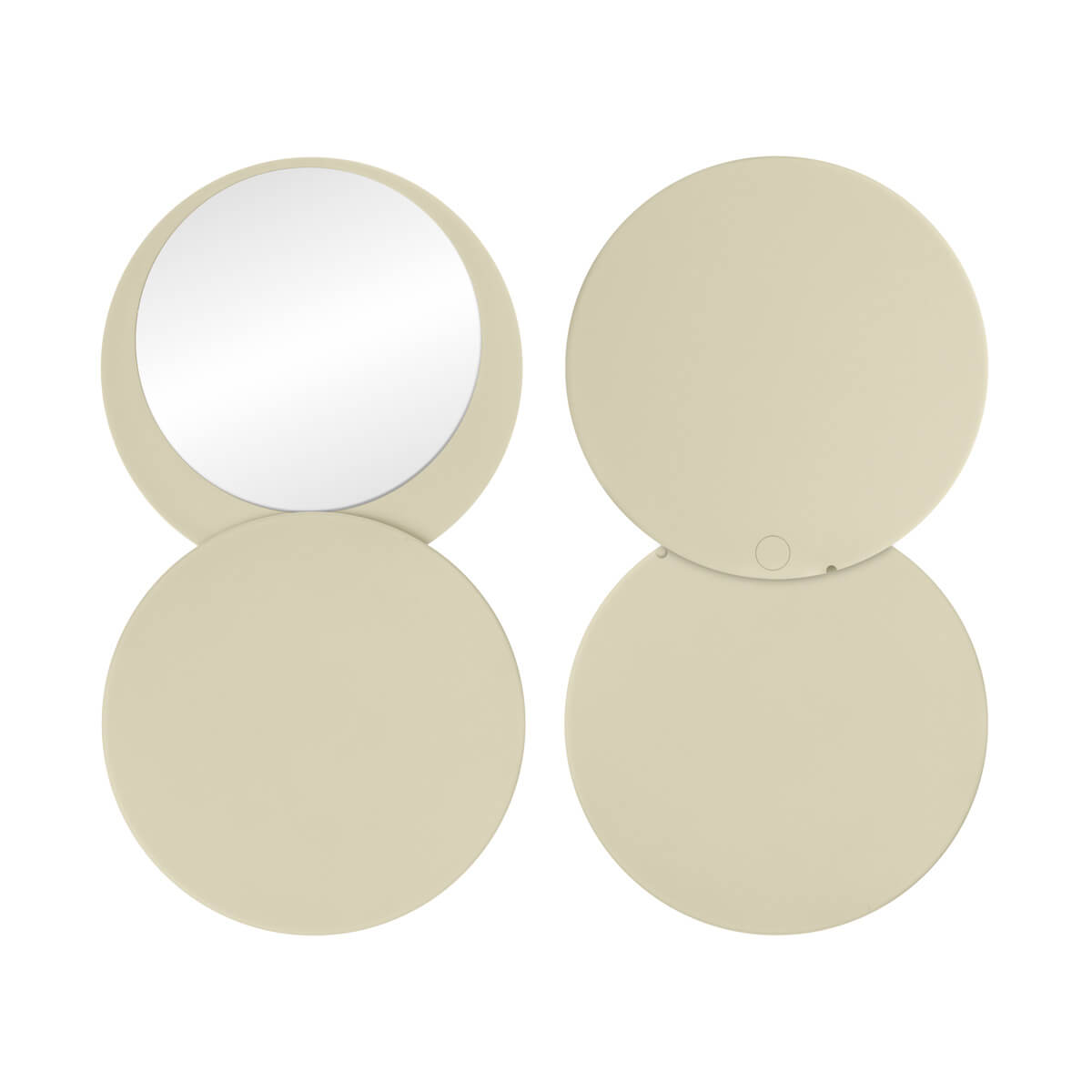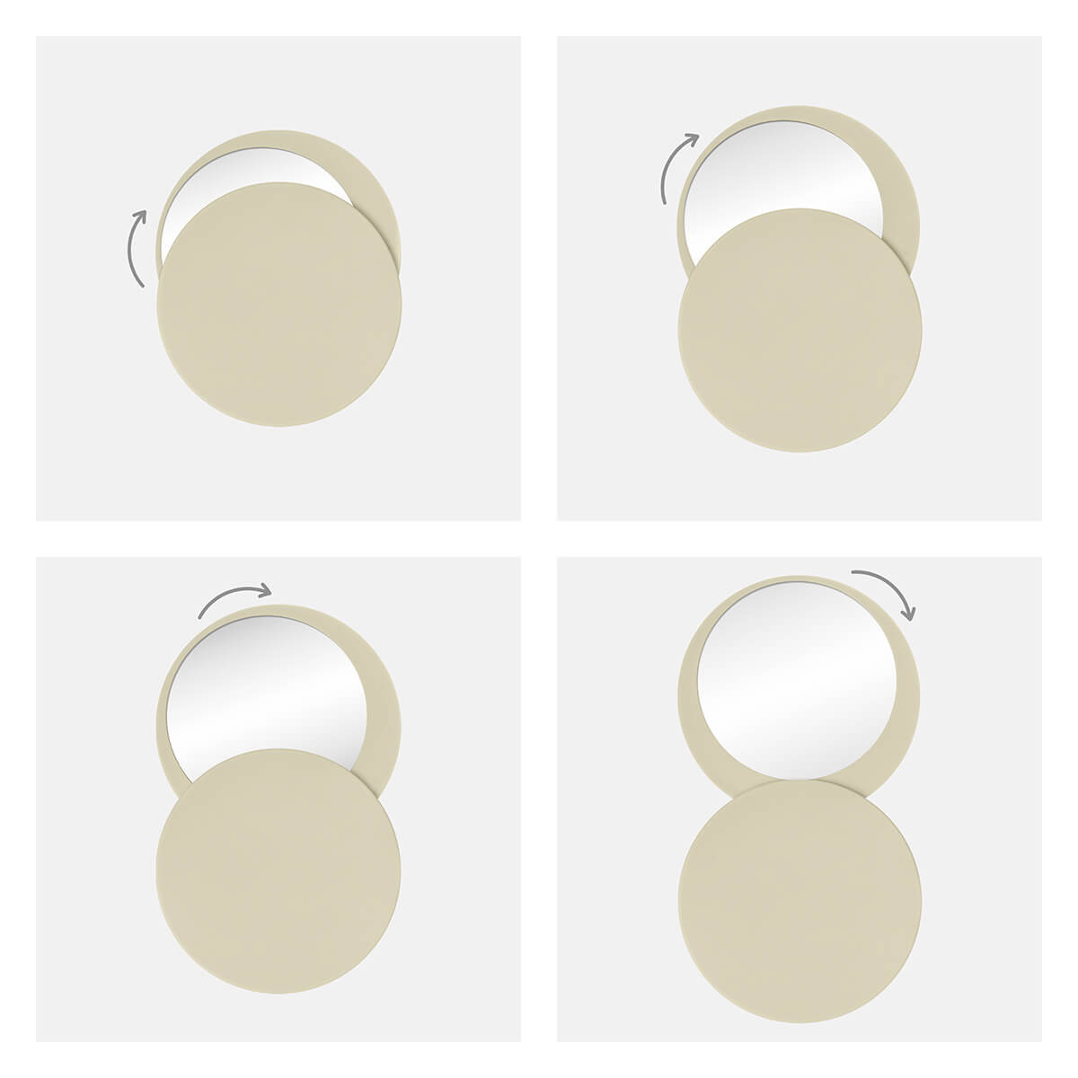 ESPEJO GLANZ - Espejo circular compacto suave al tacto. Incluye una tapa giratoria deslizable que protege el espejo mientras no lo usas. Perfecto para retoques rápidos o como un esencial en tu bolsa de viaje.