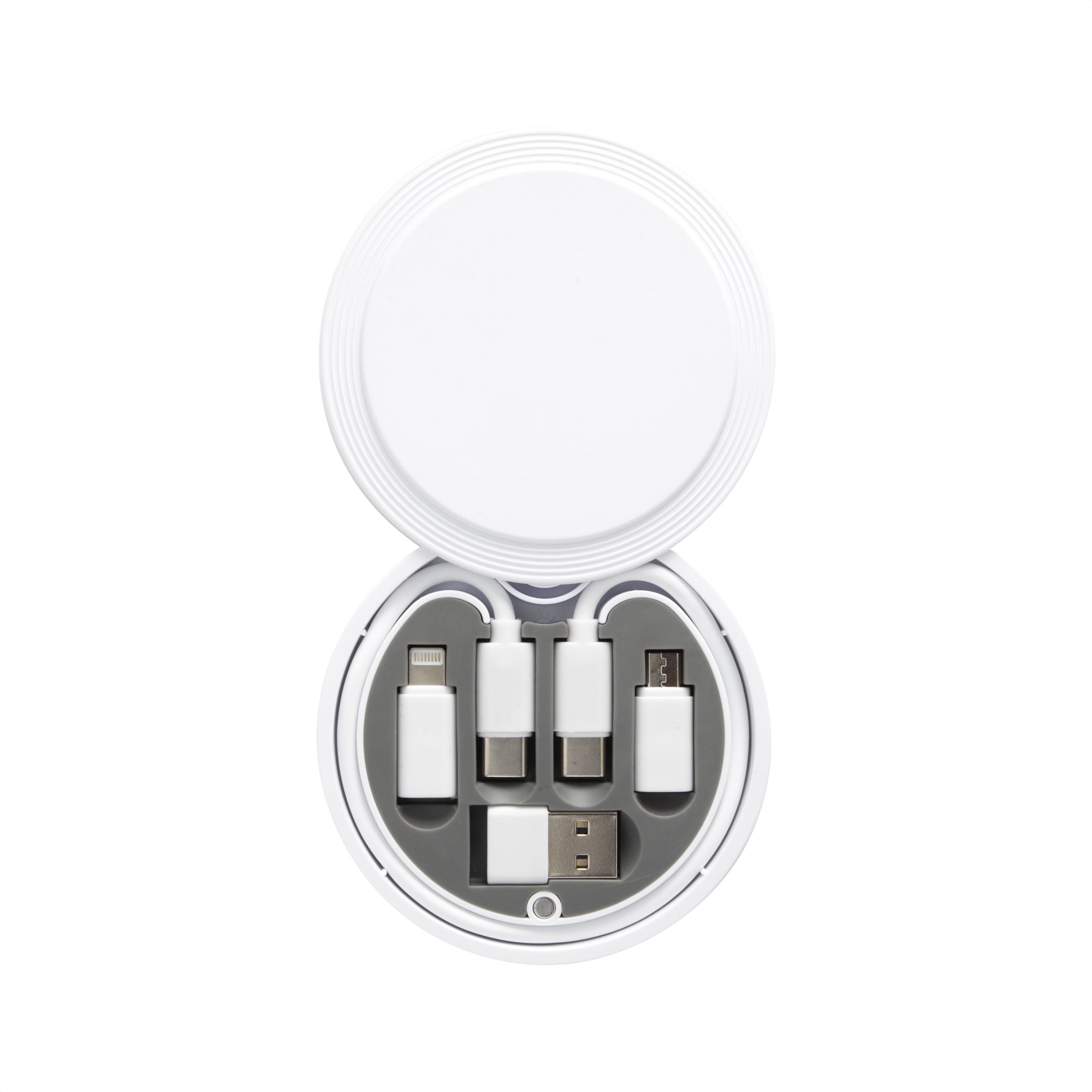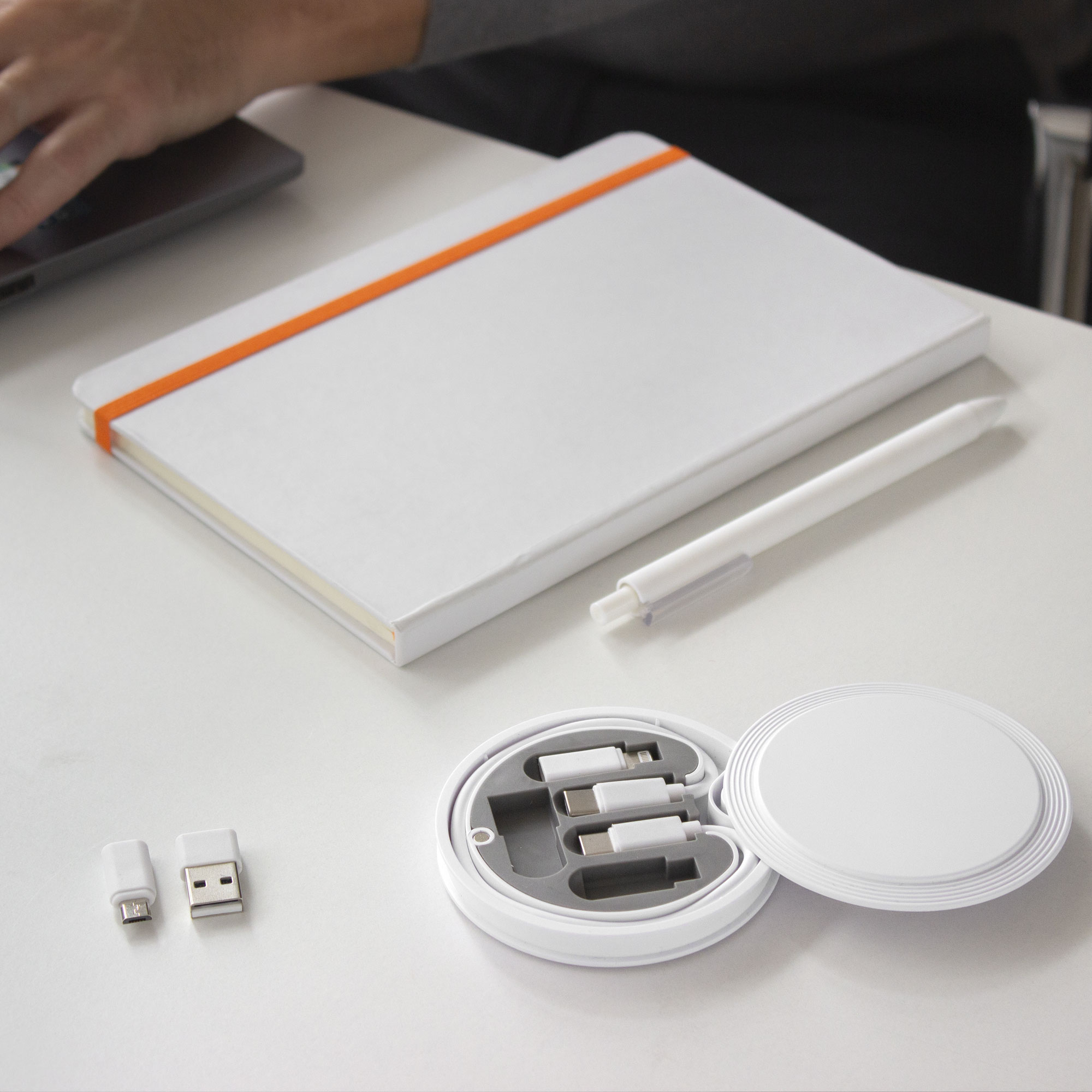 Cable de carga "NEXO" Cable de carga rápida. Estuche circular con mosquetón. Accesorios: 1 cable de carga rápida USB tipo C a USB tipo C de 60 W con transferencia de datos, 1 adaptador USB standard, 1 adaptador Lightning y 1 adaptador micro USB. Cierre magnético. Apertura por deslizamiento
