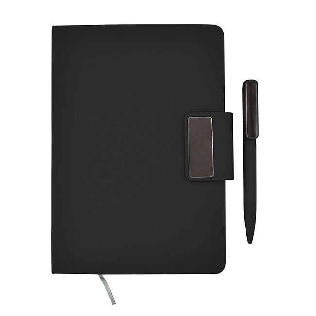 Set Barcelona Set Barcelona l Incluye libreta, bolígrafo y estuche de presentación. l Libreta con 80 hojas rayadas. l Cinta divisoria. l Cierre con ceja magnético y placa para personalizar. l Bolígrafo de metal con mecanismo rotativo. l Colores: Negro.