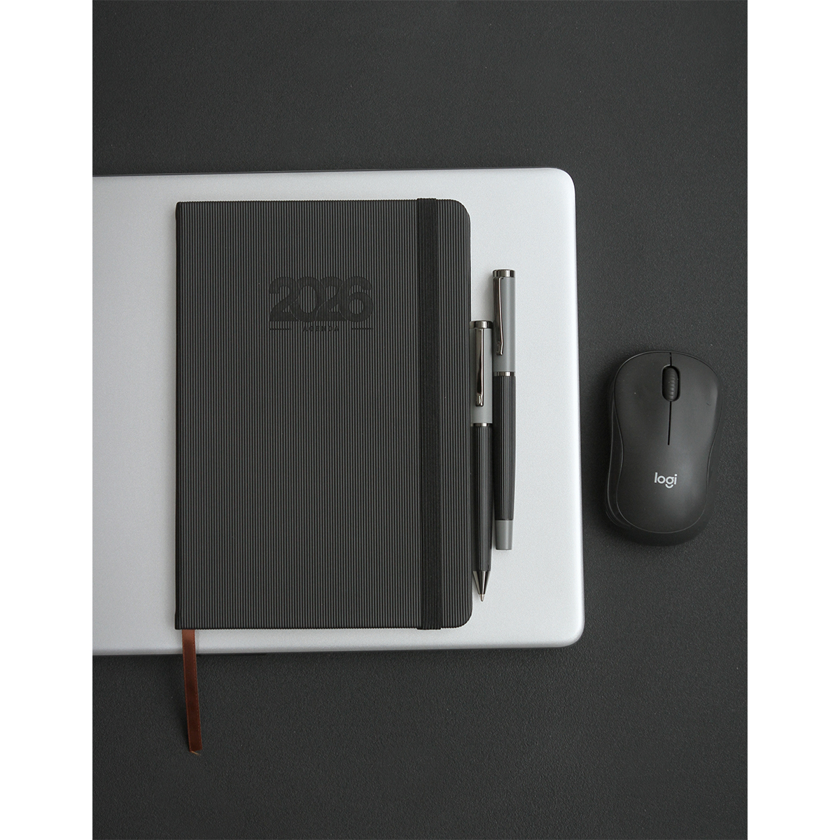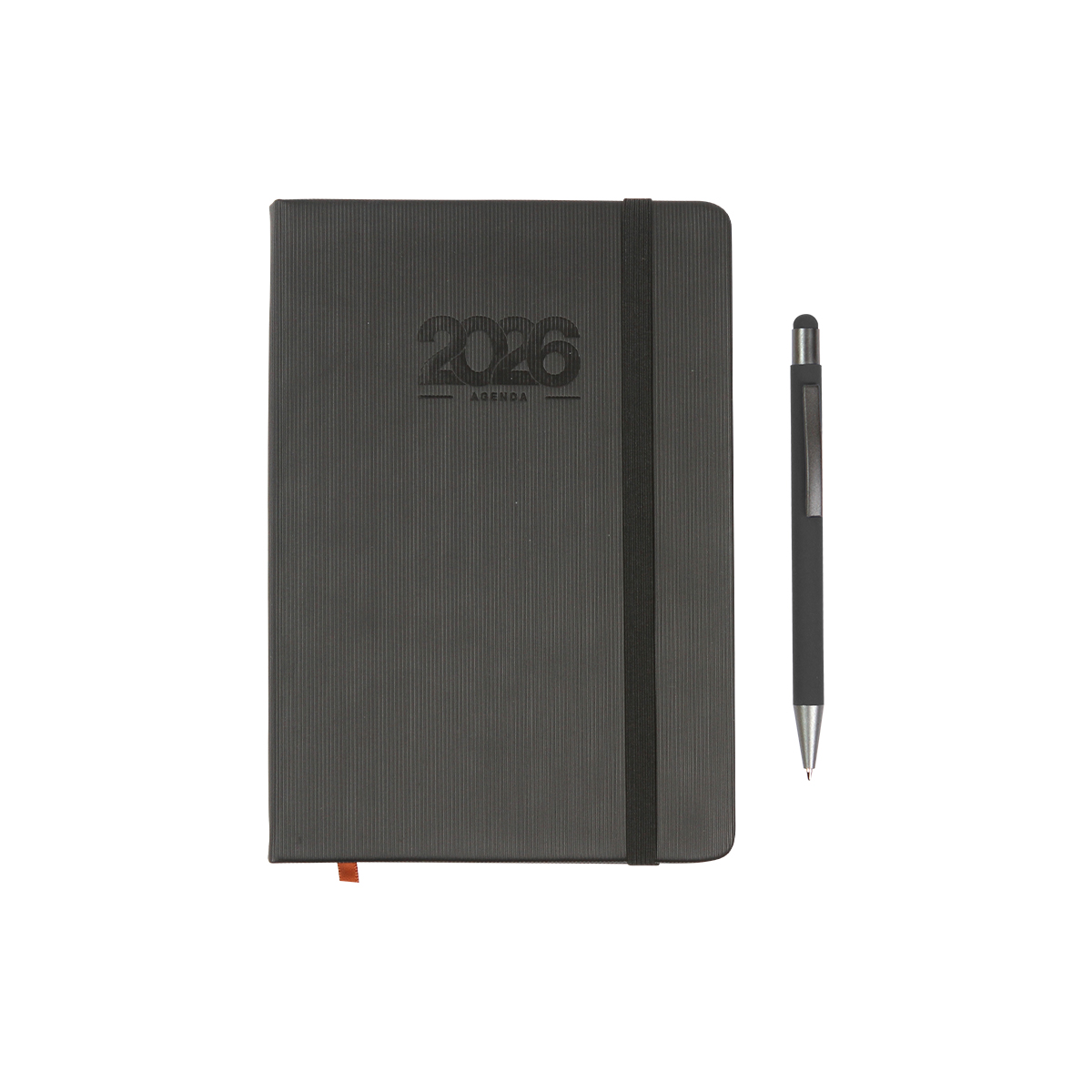 Agenda Diaria Giordano. - Set de Agenda diaria 2026 con pluma y caja de regalo. Cubierta fabricada en curpiel (PU) con resorte sujetador e interior de 175 hojas de 65 g. (350 paginas) Cada día tiene espacio para tareas importantes y está organizada por horario (5:00 am - 22:00 pm). Cuenta con: Separador de hojas, Calendario anual 2025-2027, planeador mensual, hoja de objetivos anuales, hoja de pendientes mensuales, espacio para notas, tareas, sección de contactos y bolsillo interno para almacenar documentos. Incluye caja de cartón individual y bolígrafo con tinta de escritura negra.