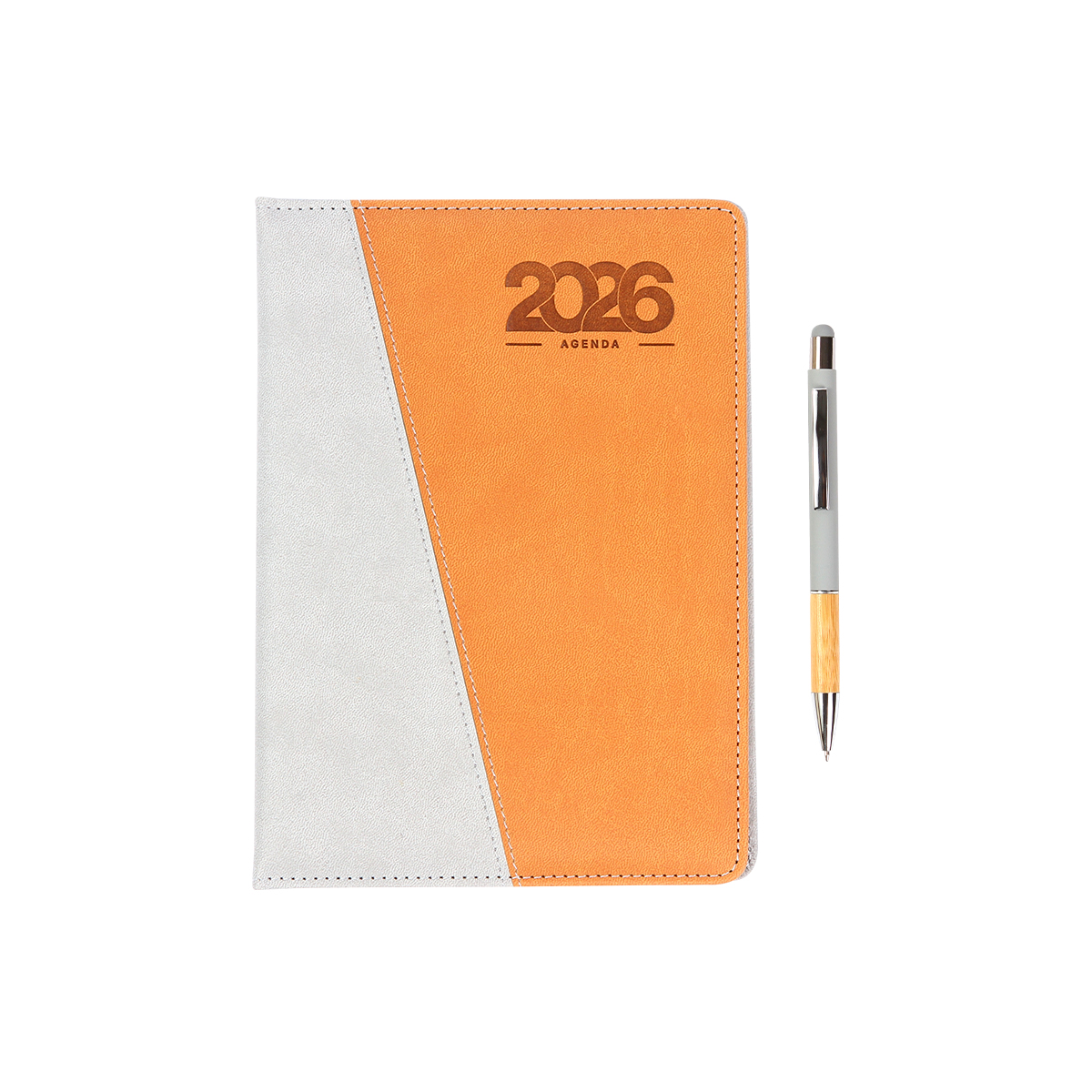 Agenda Diaria Cameri. - Set de Agenda diaria 2026 bi-tono con pluma y caja de regalo. Cubierta bi-tono fabricada en curpiel (PU) e interior de 175 hojas de 65 g. (350 paginas) Cada día tiene espacio para tareas importantes y está organizada por horario (5:00 am 22:00 pm). Cuenta con: Separador de hojas, calendario anual 2025-2027, planeador mensual, hoja de objetivos anuales, hoja de pendientes mensuales, espacio para notas, tareas, sección de contactos y bolsillo interno para almacenar documentos. Bolígrafo con detalle de bambú en la parte inferior, clip y punta metálicos y con touch en la parte superior. Incluye caja de cartón individual y bolígrafo con tinta de escritura negra.