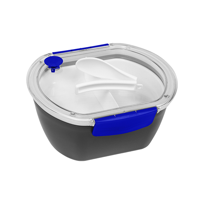 Contenedor Kerala. - Contenedor para alimentos con base en color negro fabricada en AS y tapa translúcida de silicona, cuenta con accesorios de colores que le dan un aspecto atractivo y moderno. Además, los compartimentos internos y la cuchara incorporada te brindan comodidad y versatilidad en el transporte y consumo de tus alimentos.