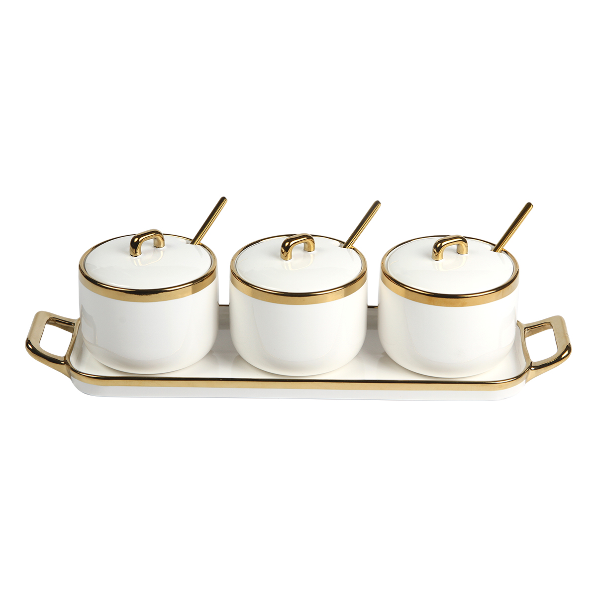 Set de contenedores Marincoli. - Set de 3 contenedores de cerámica con detalles dorados en las tapa, es una elección sofisticada y práctica para almacenar alimentos. Capacidad de 320 ml, con  detalles dorados, y cucharas doradas metálicas incluidas que van a juego con el set.
