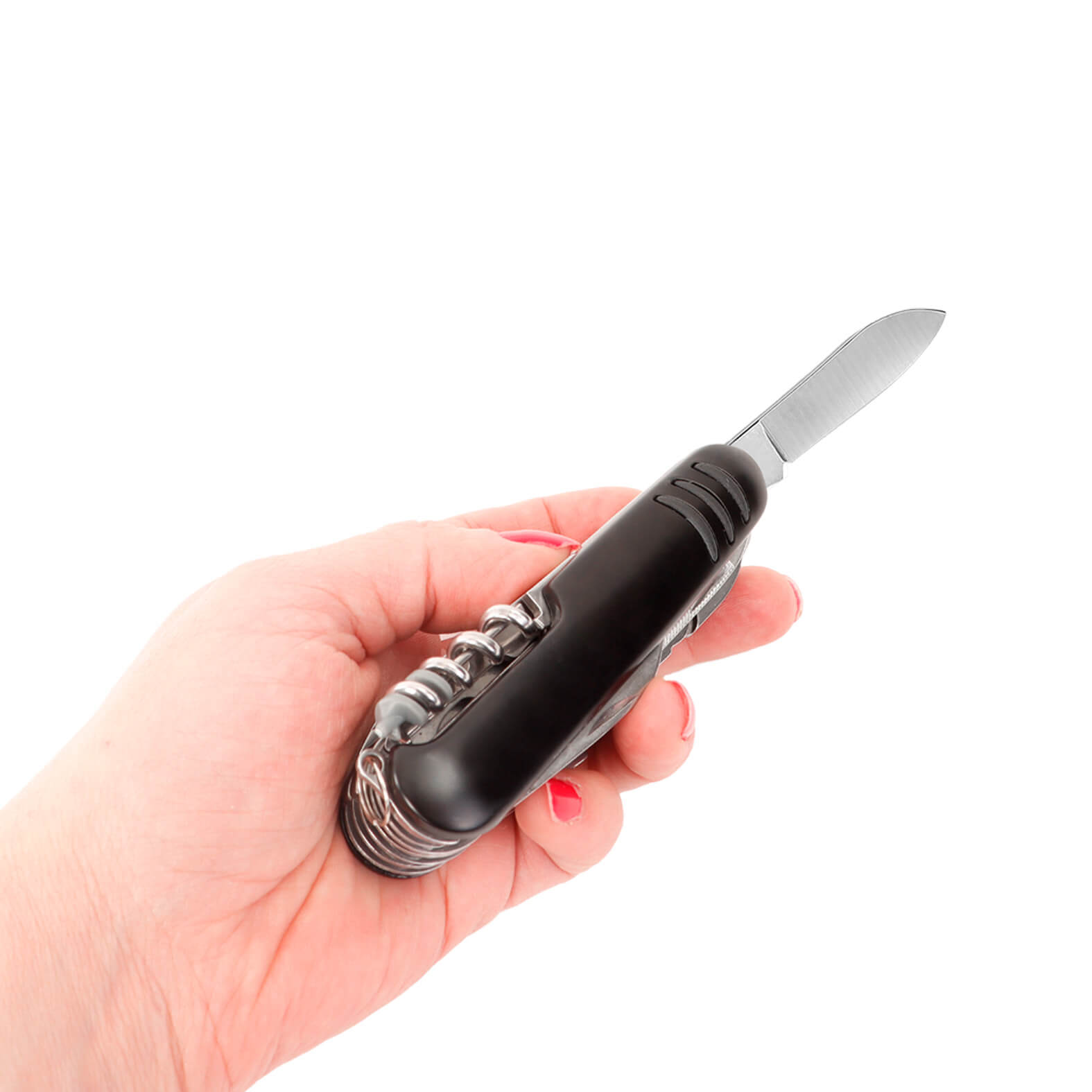 AKARI Navaja metálica multiusos con 21 funciones, entre las que destacan: sierra, destapador, abrelatas, tijeras, serrucho, navaja, sacacorchos, lima y desarmador.