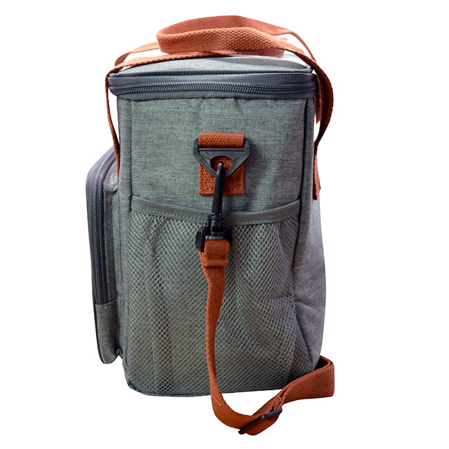 Lunchera Dressel Lunchera Dressel Interior en aluminio insulado. Etiqueta frontal para personalizar. Bolsa al frente con cierre en zipper. Bolsillos laterales en tela mesh. Asa de mano plana y correa larga ajustable. Colores: Gris