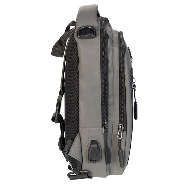 Backpack Baylor Salida lateral para usb. Impermeable al agua. Asa de mano reforzada y acojinada. Compartimento frontal con detalle de argolla y práctico Bolsillo con cierre en zipper. Etiqueta inferior para personalizar. Compartimento interior para tablet. Correa en diseño lateral cruzado.