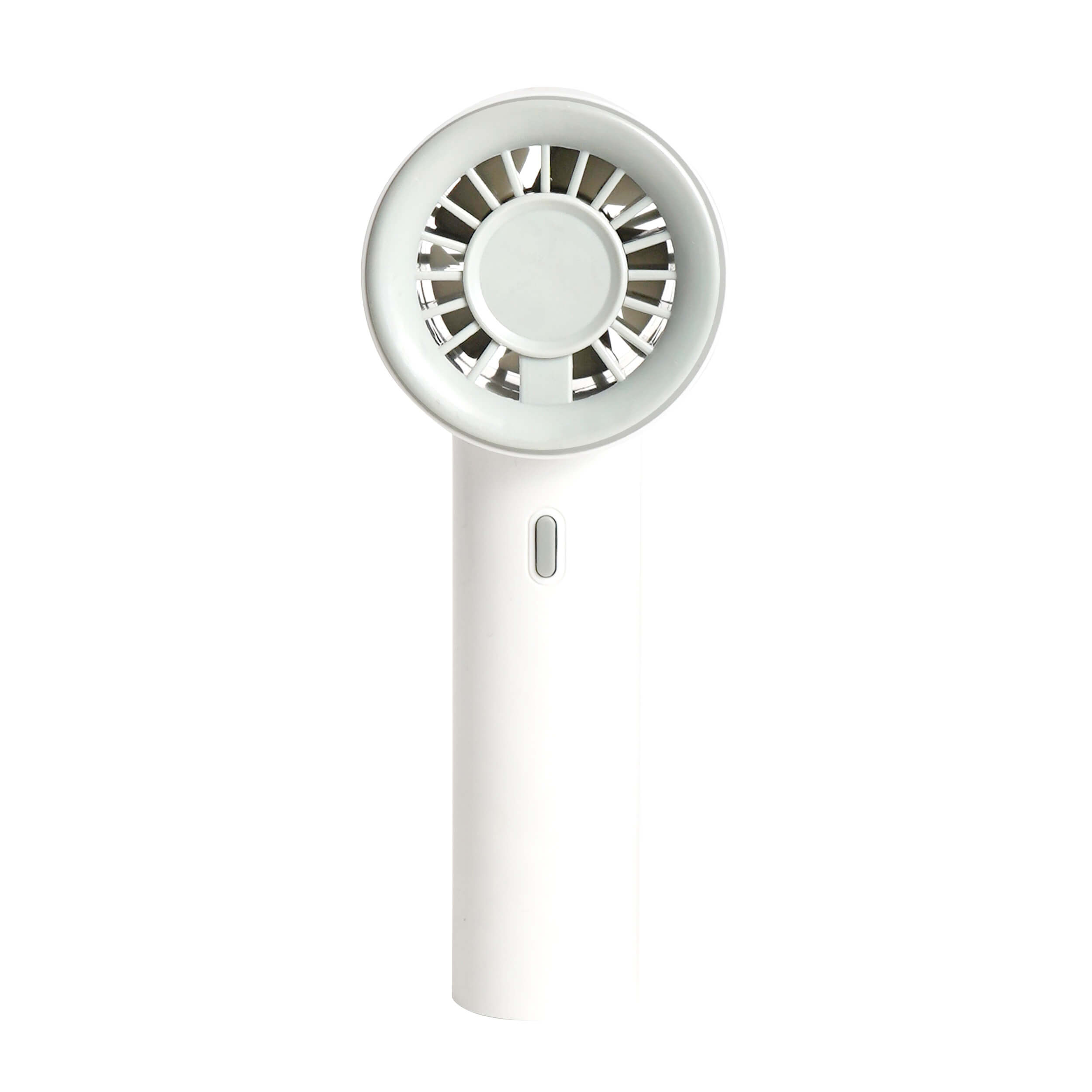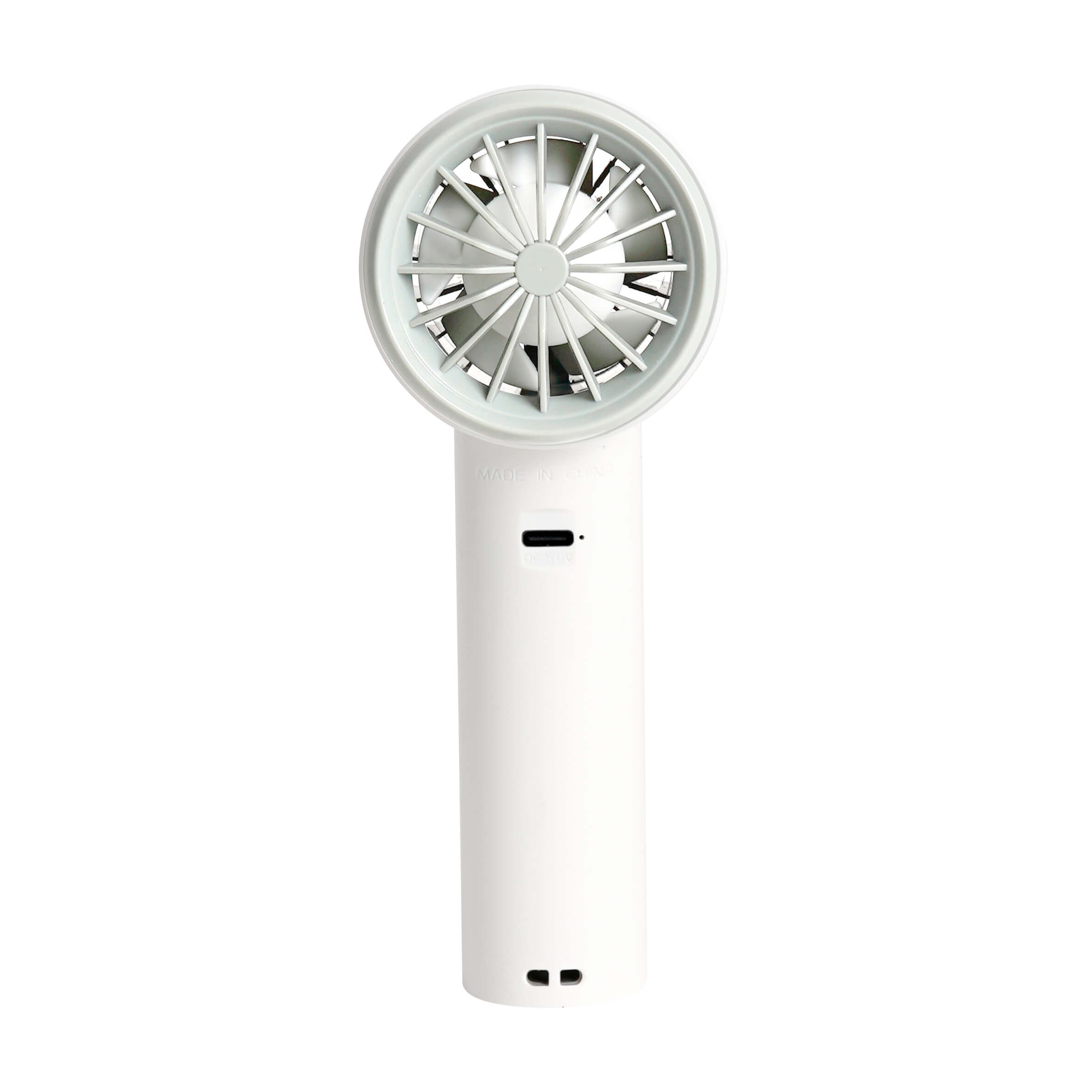 WIND Ventilador portátil con mango de plástico y diseño minimalista. Cuenta con botón de encendido/apagado, 3 velocidades y puerto de carga tipo C.