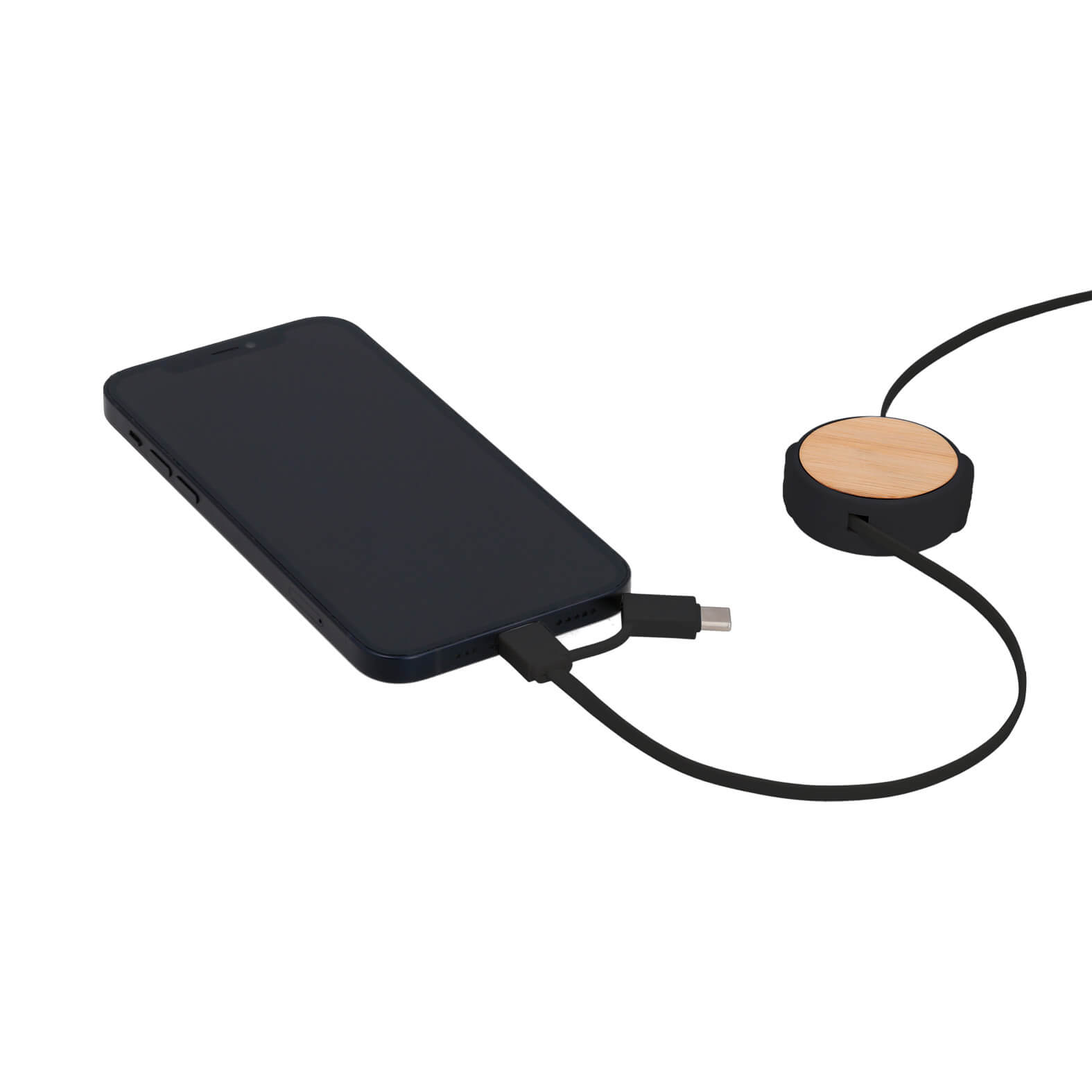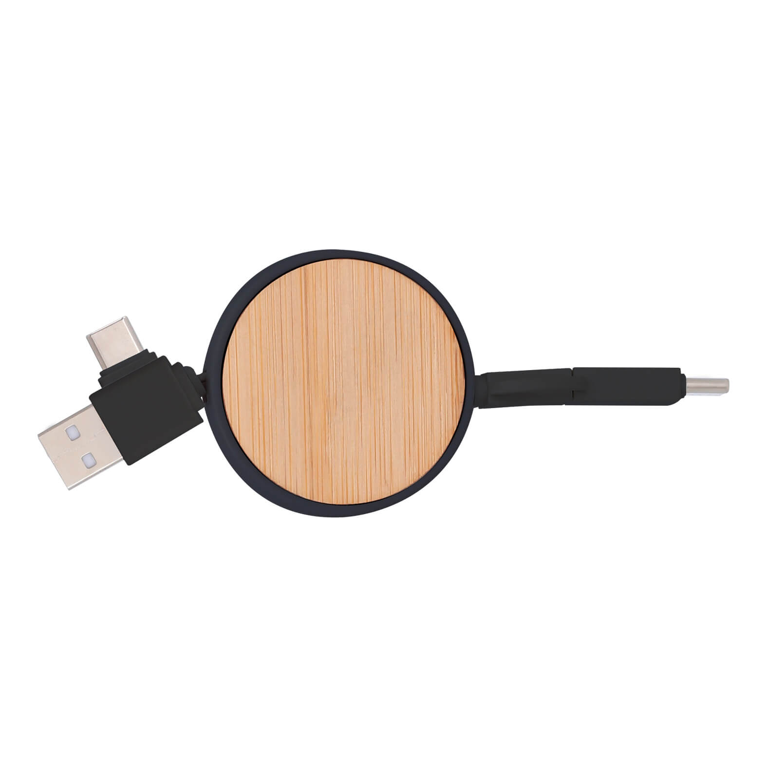 BAMBI Cargador multifuncional circular con detalle de bambú, entrada tipo USB, tipo C, conector de salida tipo lightning y tipo C.