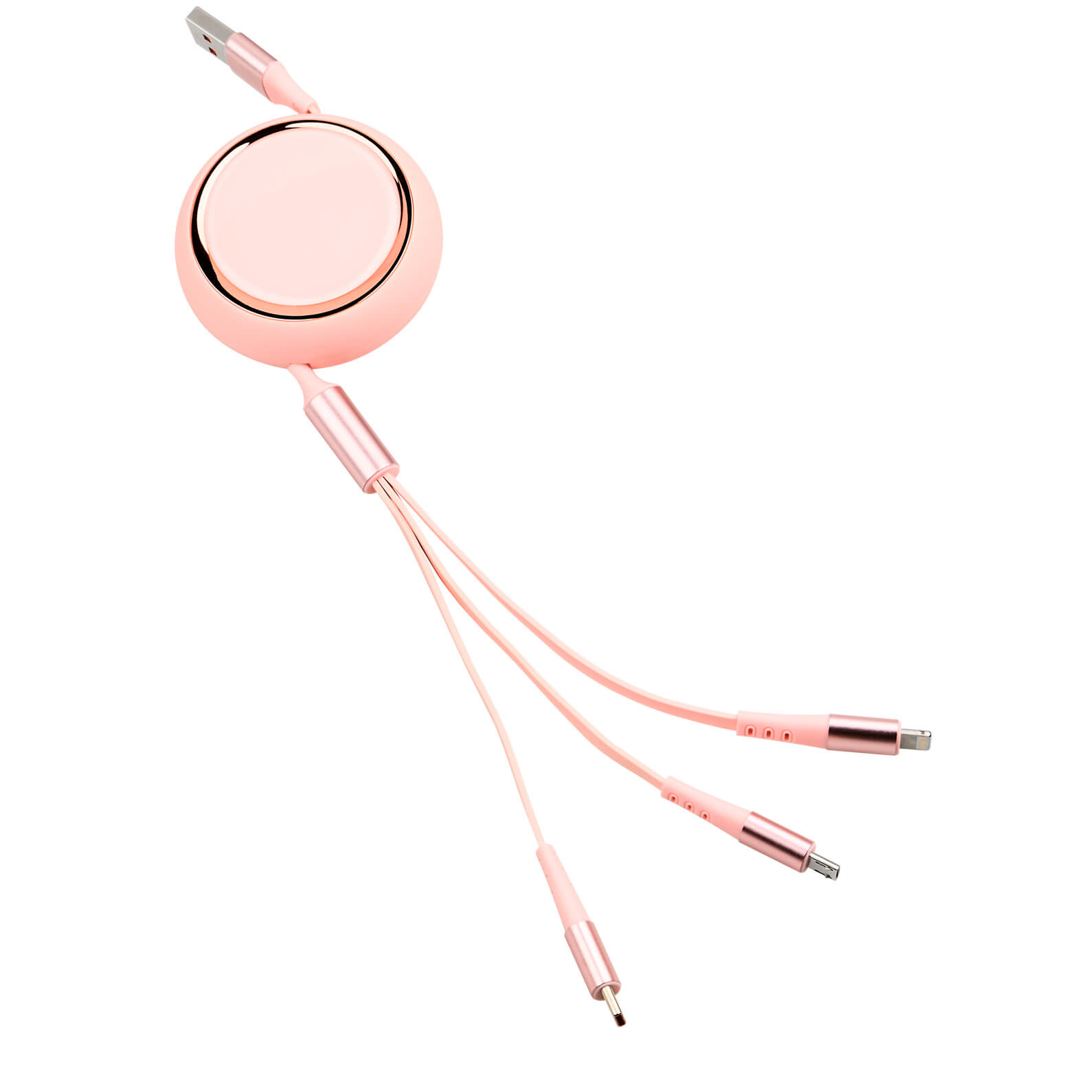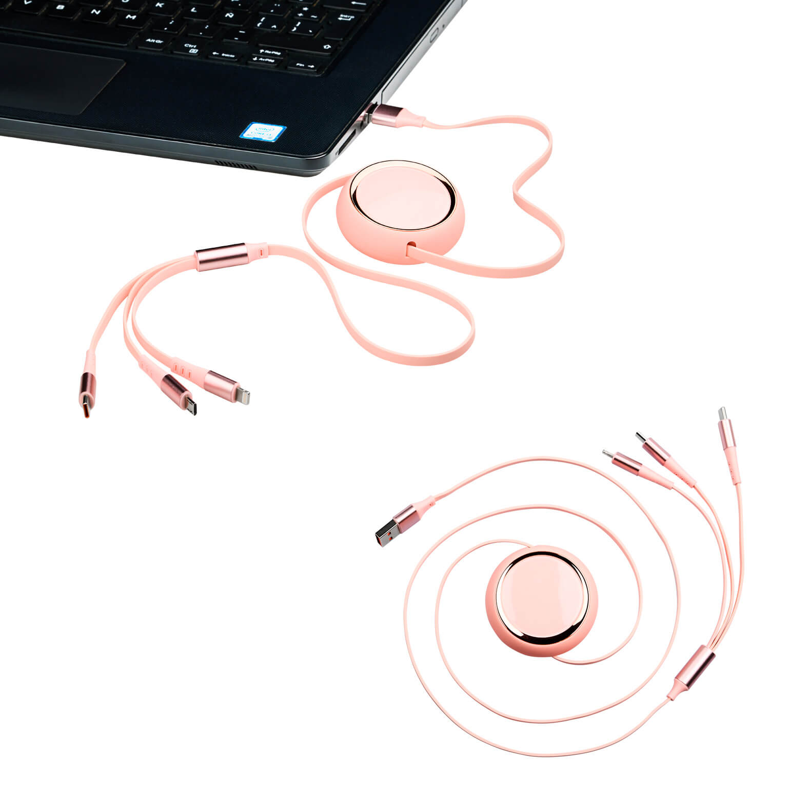 QIPI Cargador multifuncional extensible circular (115 mts.) con acabado rubber. Cuenta con entrada USB y conectores de salida micro USB, tipo C y Lightning.