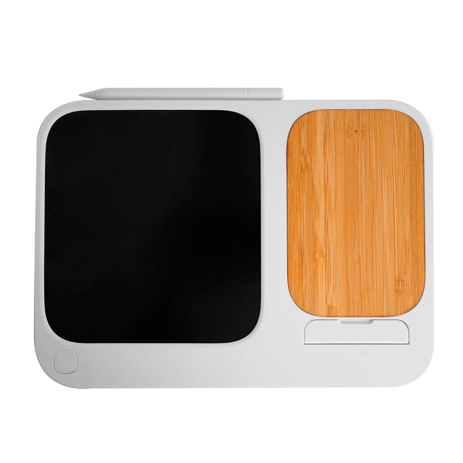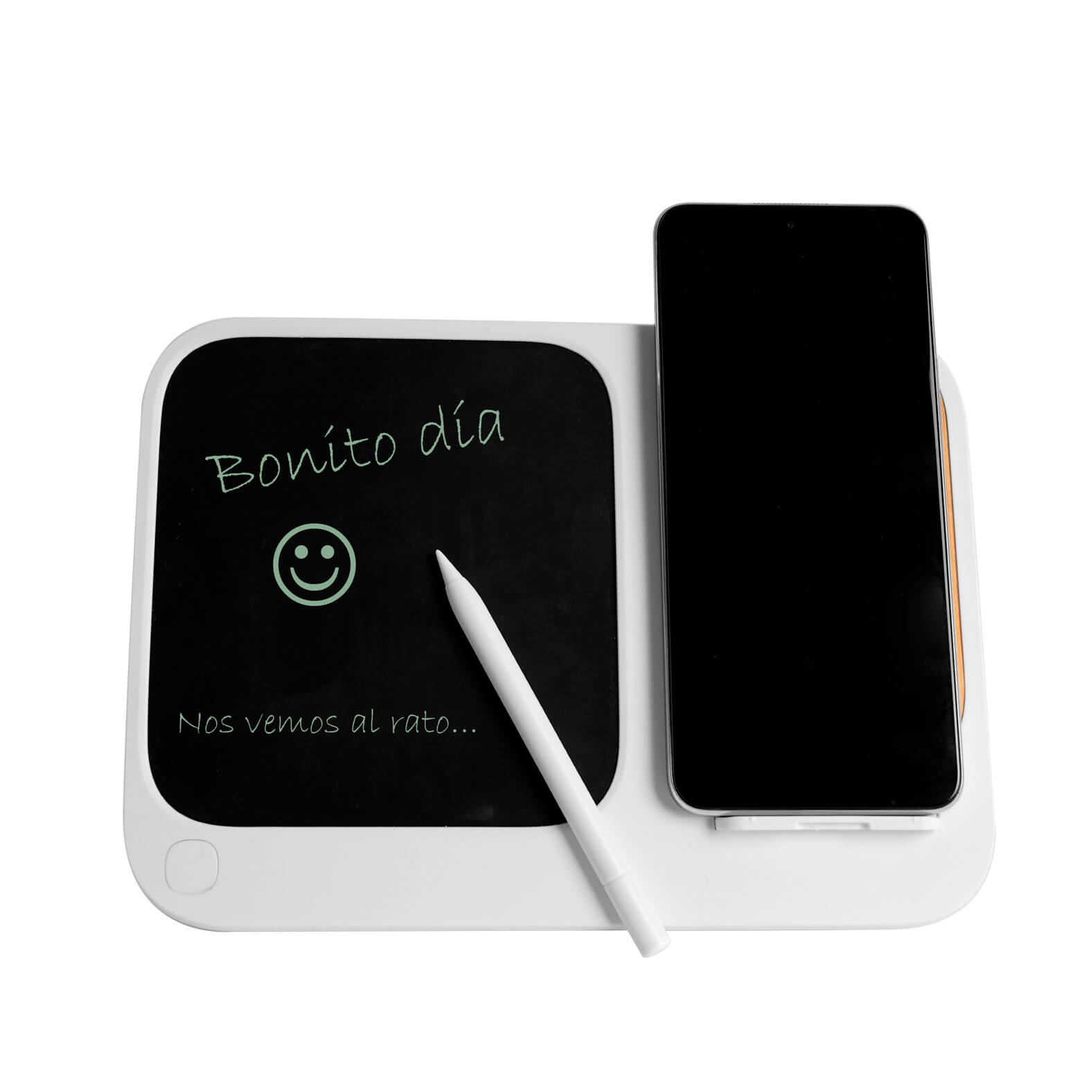 EMERIC Cargador wireless con soporte para celular y pizarrón digital de plástico, con plumilla magnética. Cuenta con un botón para eliminar escritura y un botón de bloqueo para evitar la pérdida de información. Incluye cable tipo C. (Compatible con dispositivos con tecnología Qi).
