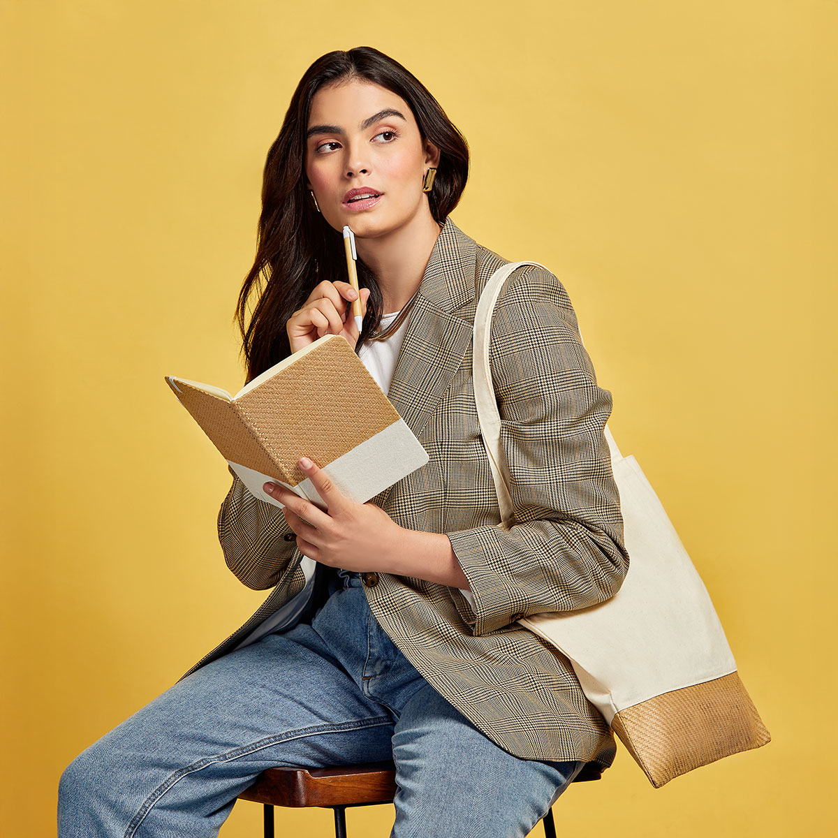 MATERIAL: Cartón / Algodón / Papel MEDIDAS: 28.8 x 22.2 x 5 cm Caja / 35 x 40 cm Bolsa / 14.5 x 21 cm Libreta / 1 x 14 cm Bolígrafo IMPRESION: Serigrafía / Tampografía MED. EMPAQUE: 45.5 x 29.5 x 29.5 cm PESO EMPAQUE: 0.7 Kg PIEZAS EMPAQUE: 10