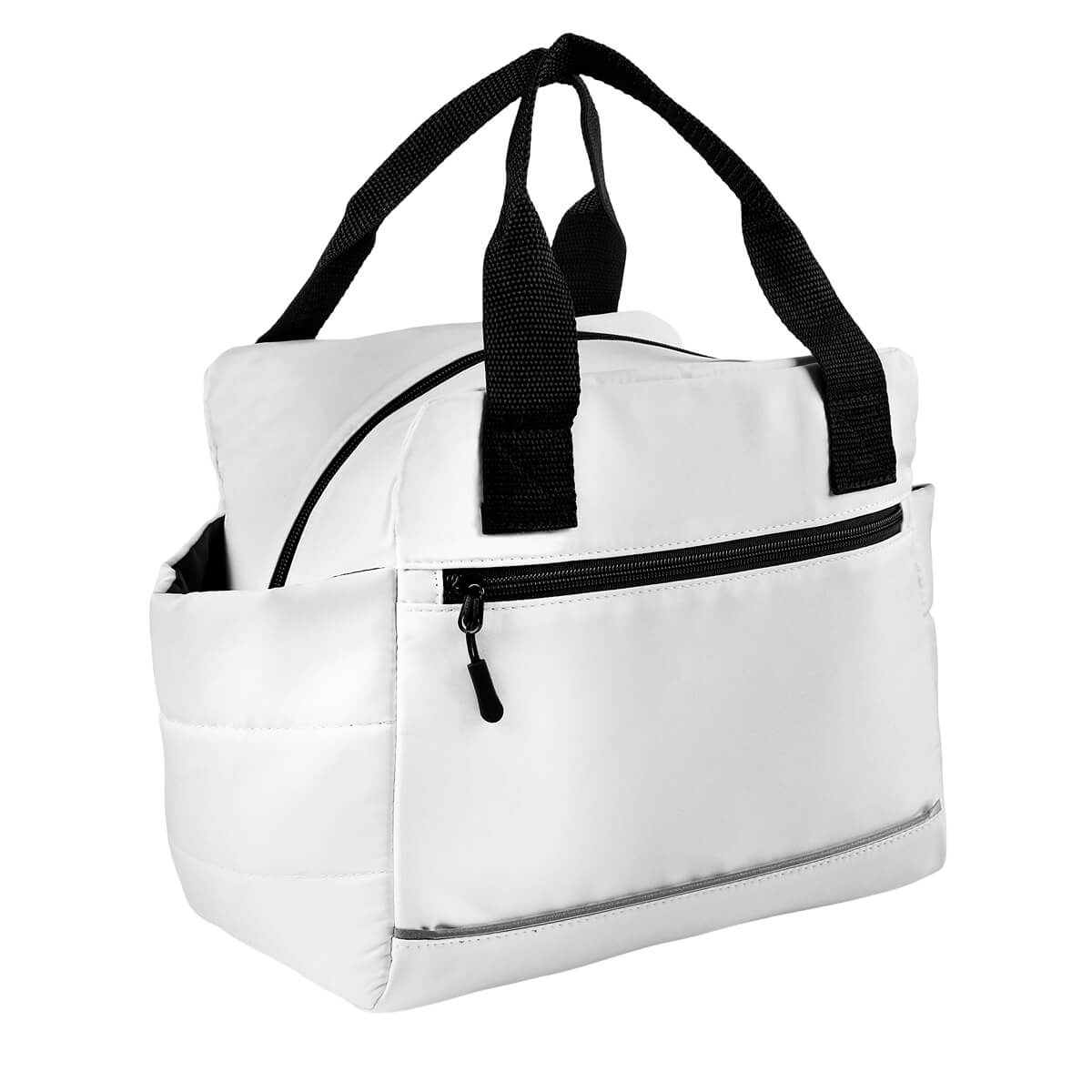 LONCHERA NUAN - Lonchera con interior plastificado. Compartimento principal con cierre, dos bolsillos laterales y un bolsillo frontal también con cierre, ideal para llevar contigo pequeños snacks. Adicional, agregar un detalle reflejante en la parte frontal, lo que aporta un toque de diseño. Ideal para escuela u oficina, lleva tus alimentos con estilo y de forma segura. Capacidad 12 latas.
