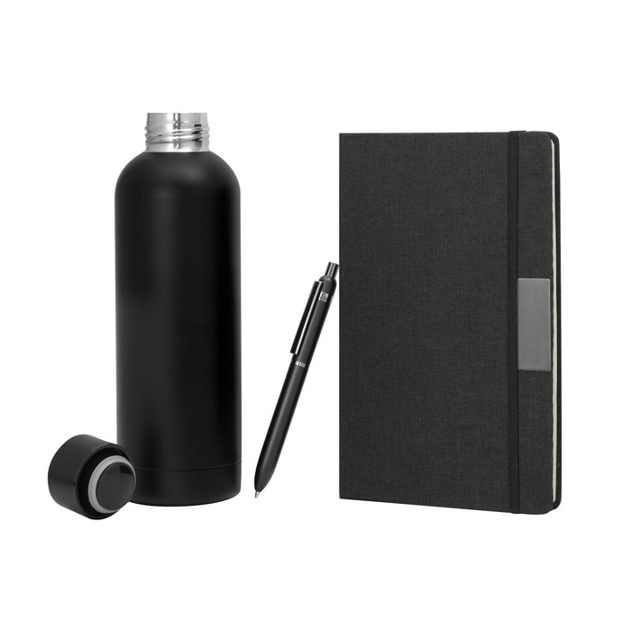 - 1 libreta color negro de 14 x 21 x 1,5 cm. Con placa metálica color gun de 5 x 2 cm. Tapa de cartón 300g recubierta en RPET 310. Interior de 80 hojas rayadas de 70g. Encuadernación cosida y cierre con banda elástica color negro.