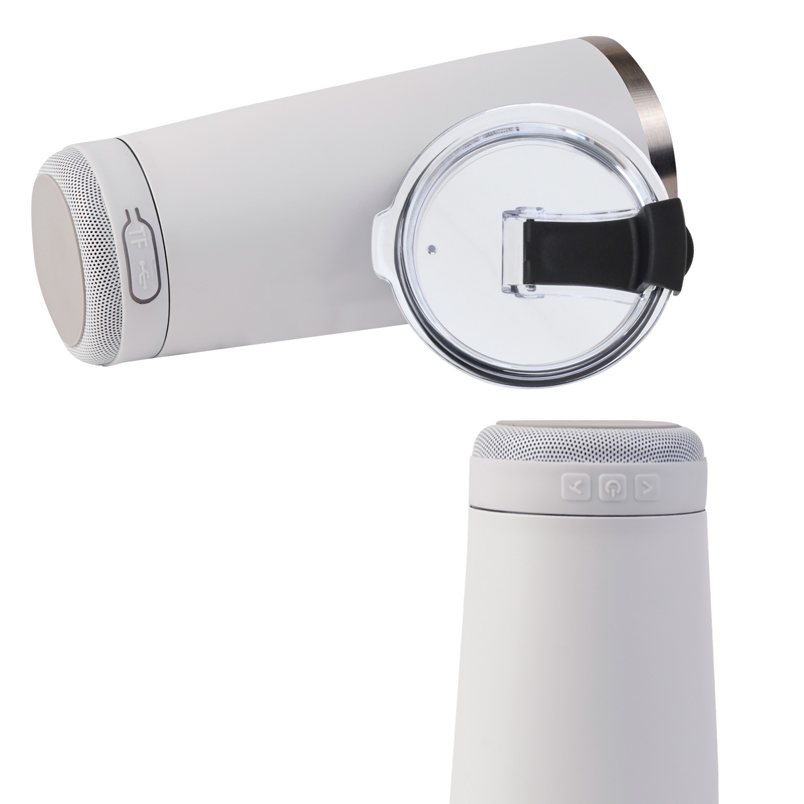 DOPIO Termo aislado al vacío con doble pared de acero inoxidable, acabado plastic painting, equipado con bocina Bluetooth que cuenta con controles de volumen, botón de reproducción, efectos de luz y puerto para tarjeta TF. Incluye cable tipo C. La bocina es removible de la base del termo.