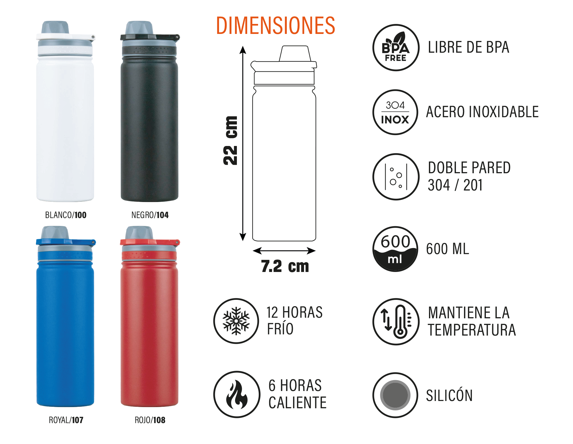 TERMO CALIFORNIA ROJO 600 ML ACERO DOBLE DEPORTIVO TIPO BOTELLA CON AGARRADERA Y ANTIDERRAPANTE