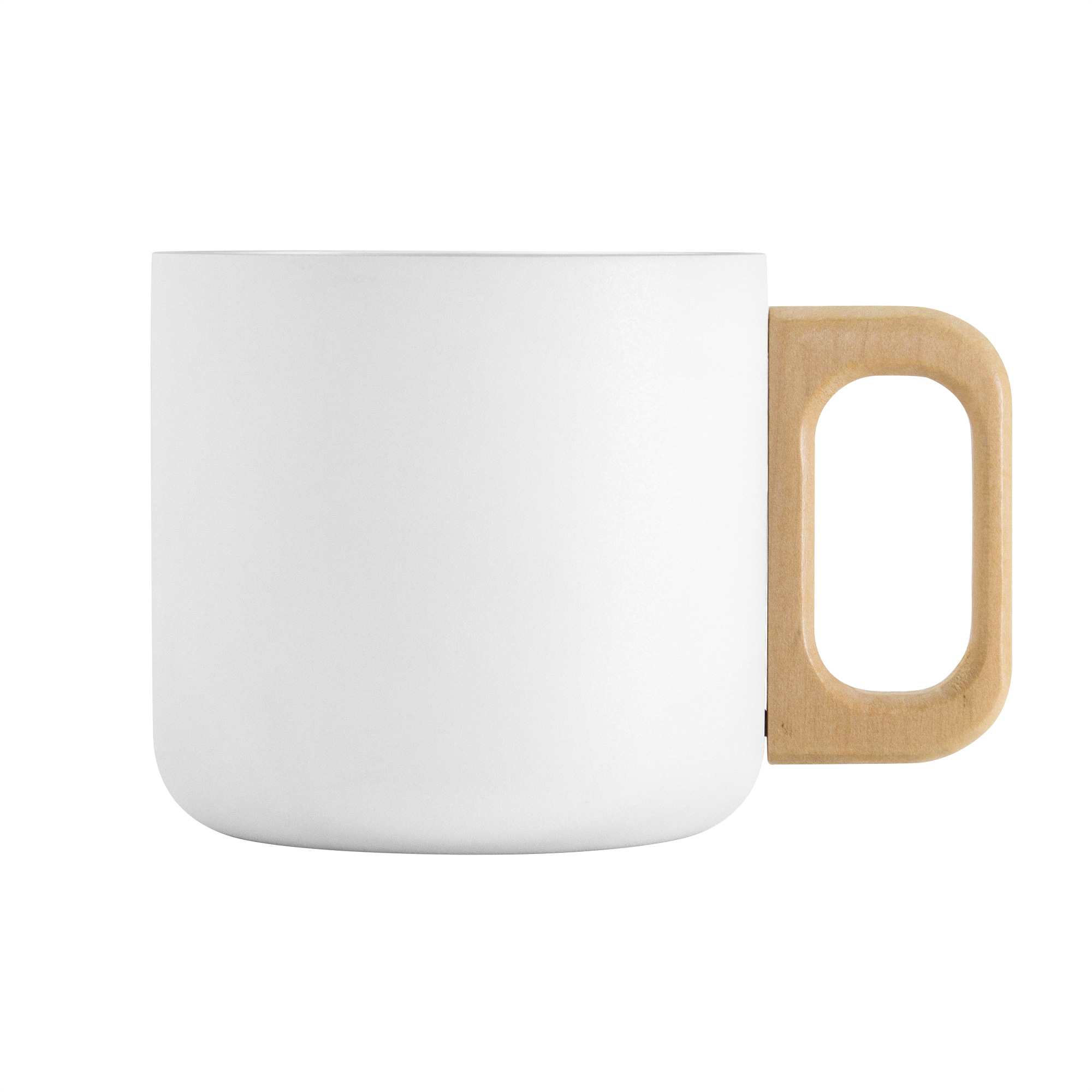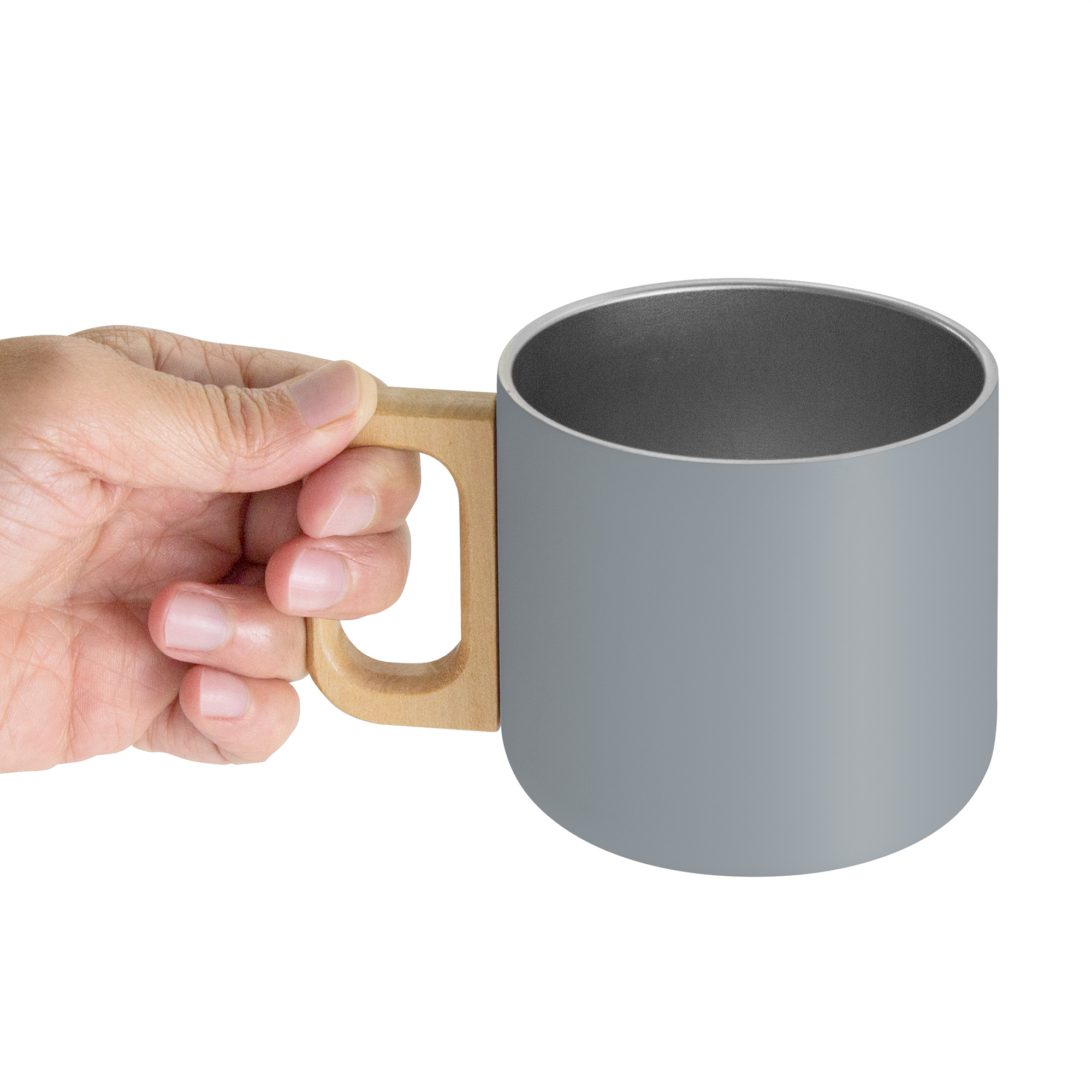 Taza térmica "TIMBER II" Taza doble pared, sellada al vacío. Interior de acero 304 y exterior de acero 201. Asa de madera color natural. Pintura powder coat (pintura más duradera y resistente a la corrosión y el paso del tiempo). Mantiene las bebidas frías o calientes por más tiempo.