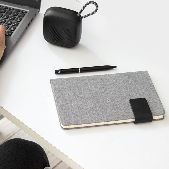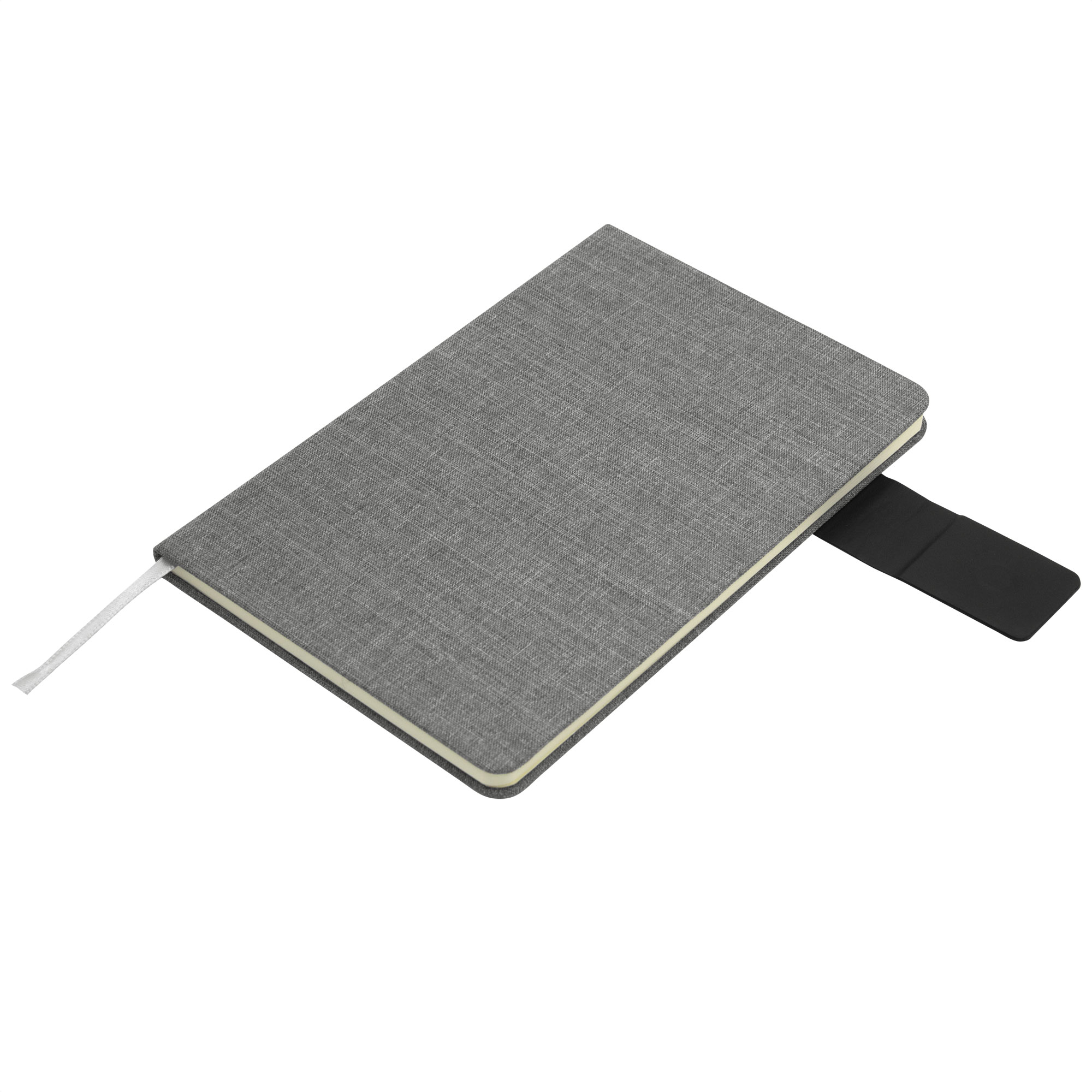 Libreta "TIK" Libreta. Tapa de cartón de 1,8 mm recubierta en RPET color gris con tira de poliuretano color negro con cierre magnético. Interior de 80 hojas rayadas en papel obra crema de 70g. Encuadernación cosido. Incluye cinta señaladora del color de la tapa