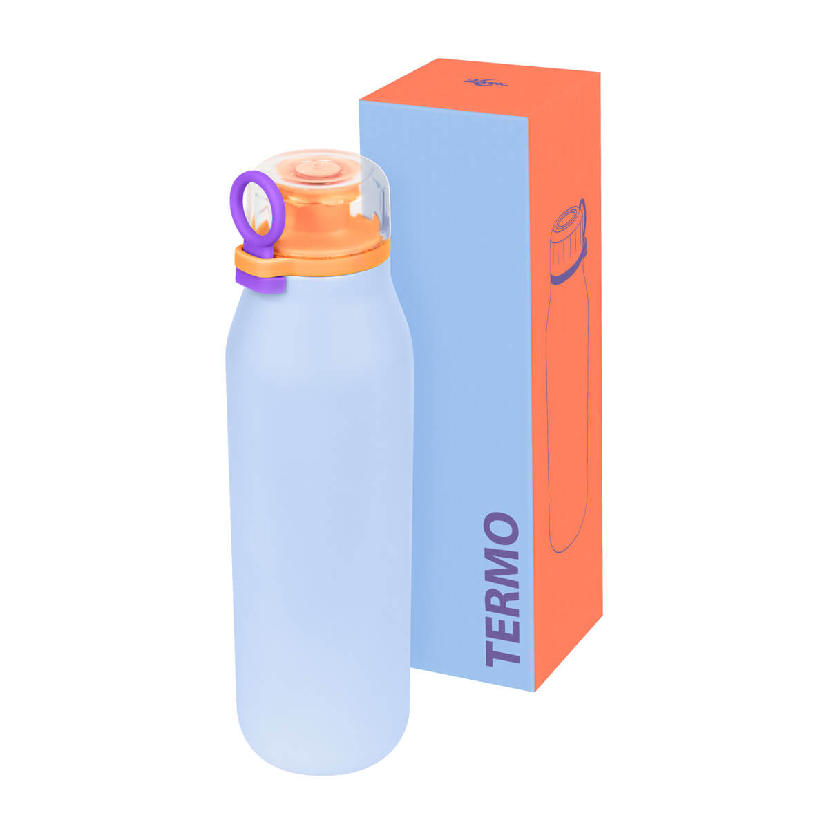 TERMO DAIRE - Termo doble pared. Cerrado al vacío. Pared interna y externa de acero inoxidable. Tapa son sistema de rosca y amplia boquilla para beber fácilmente o verter con mayor facilidad tus bebida favoritas. Incluye una pequeña asa de silicón que favorece su transporte. Diseño único, con una divertida fusión de colores cuidadosamente seleccionados, que lo convierten en un accesorio exclusivo, moderno y diferente a cualquier otro. Mantiene temperatura caliente 6 hrs y temperatura fría 6 hrs. Capacidad 20 Oz. Incluye caja individual.