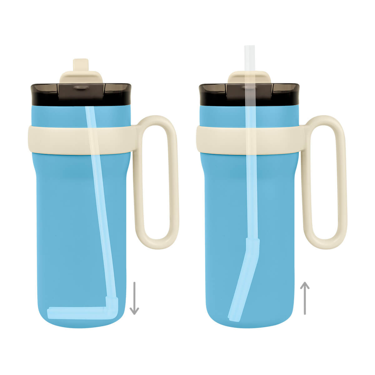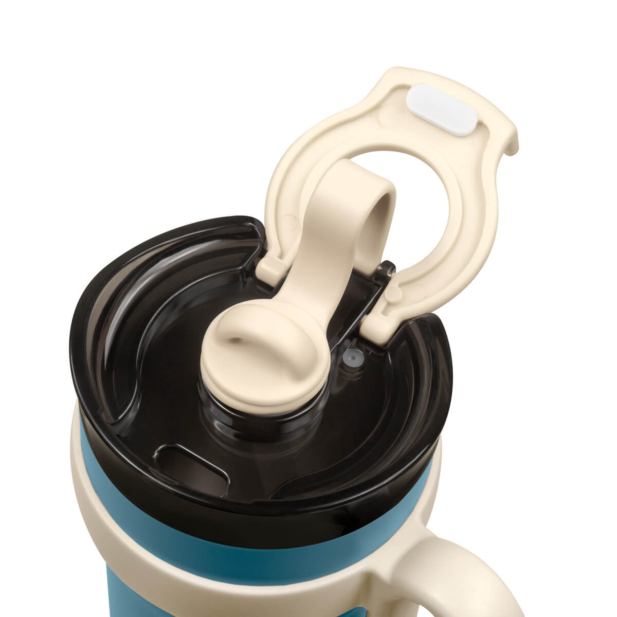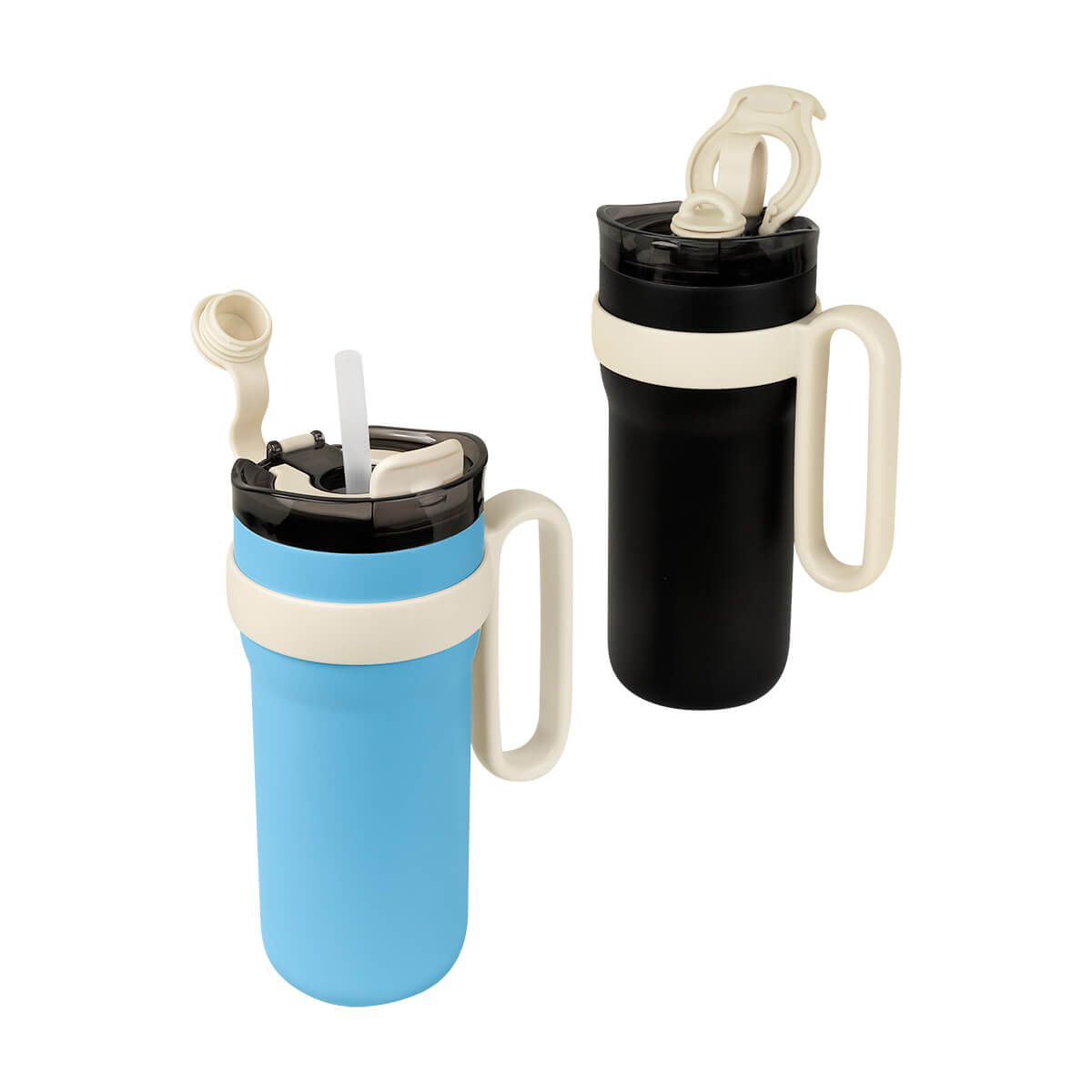 TERMO RANTAI - Termo doble pared. Cerrado al vacío. Pared interna y externa de acero inoxidable. Cuerpo con terminado rugoso. Incluye tapa con cierre de rosca que ofrece dos alternativas de uso, sobretapa con sistema push y ranura especial para popote con aditamento para cerrar y evitar derrames. Incluye popote de plástico que cuenta con un mecanismo de salida automática y una base de silicón, que lo eleva al abrir el compartimento. Además, su original asa permite llevarlo cómodamente a cualquier lugar. Mantiene temperatura caliente 6 hrs y temperatura fría 8 hrs. Capacidad 30 Oz. Base de 8.5 cm de diámetro. Incluye caja individual.