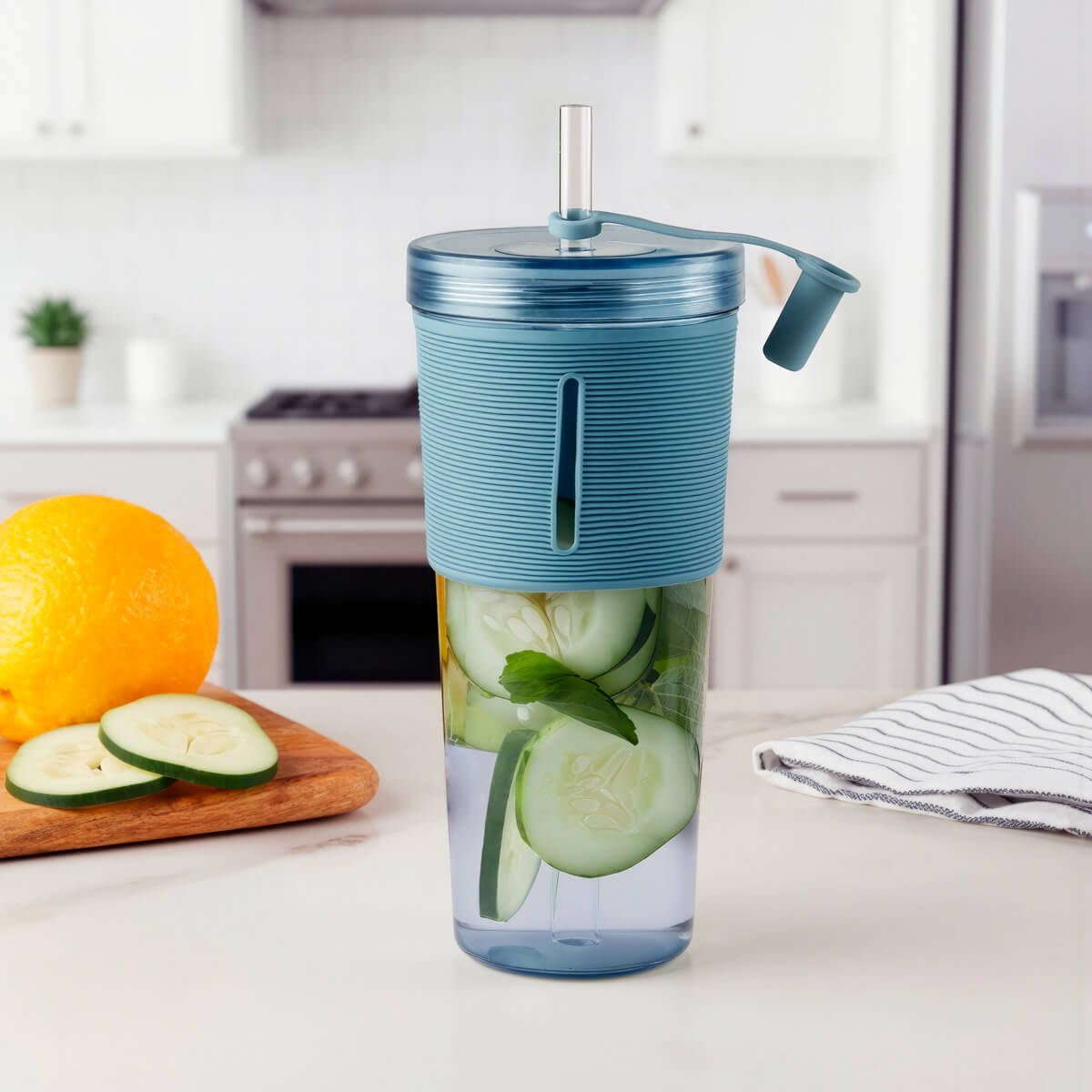 VASO JOHOR - Vaso de plástico de una sola pared. Tapa de plástico con sistema de rosca. Incluye popote reutilizable con tapón de silicón. Su diseño con manga de silicón antideslizante, proporciona un agarre cómodo y seguro. Capacidad 20 Oz. Base de 6.7 cm de diámetro. Incluye caja individual.