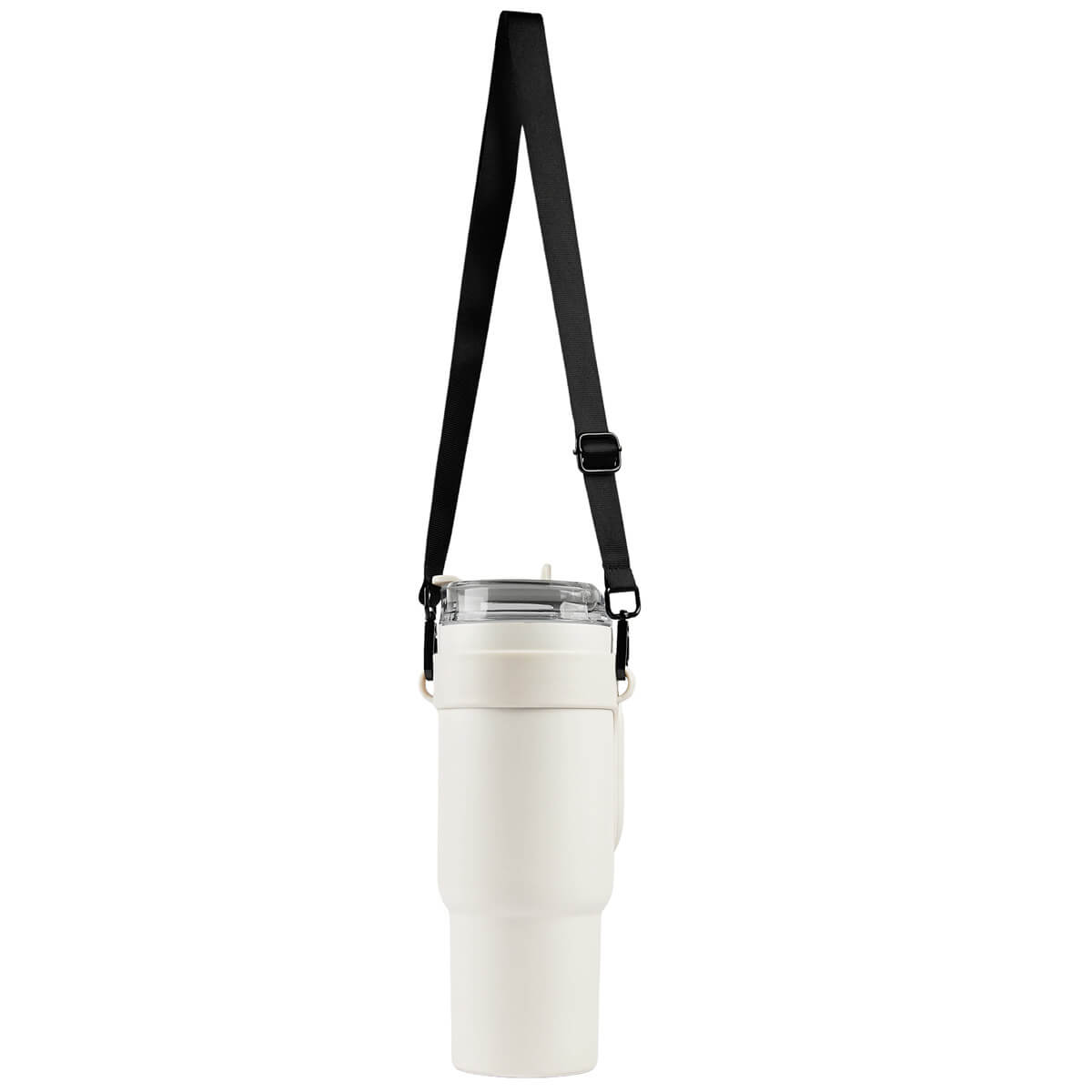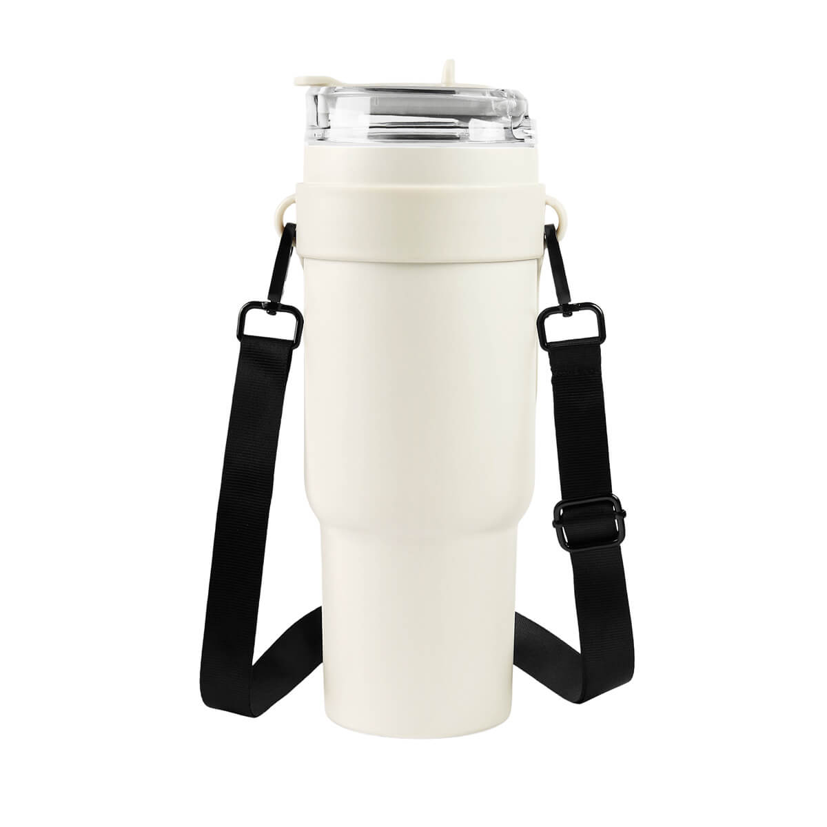 TERMO CANADA - Termo doble pared. Cerrado al vacío. Pared interna y externa de acero inoxidable. Terminado rugoso que facilita su agarre. Incluye tapa de plástico con sistema de rosca y la sobretapa mulitfuncional, permite beber por medio de su boquilla clásica o a través de su boquilla plegable con popote. Su diseño innovador incorpora un asa plegable para un uso más práctico y un asa para hombro ajustable y removible, con broches metálicos. Mantiene las bebidas calientes hasta por 6 hrs y frías hasta por 8 hrs. Capacidad de 30 Oz. Base de 7.4 cm de diámetro. Incluye caja individual.