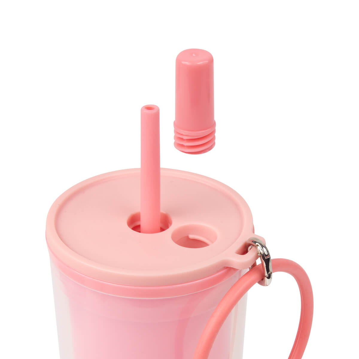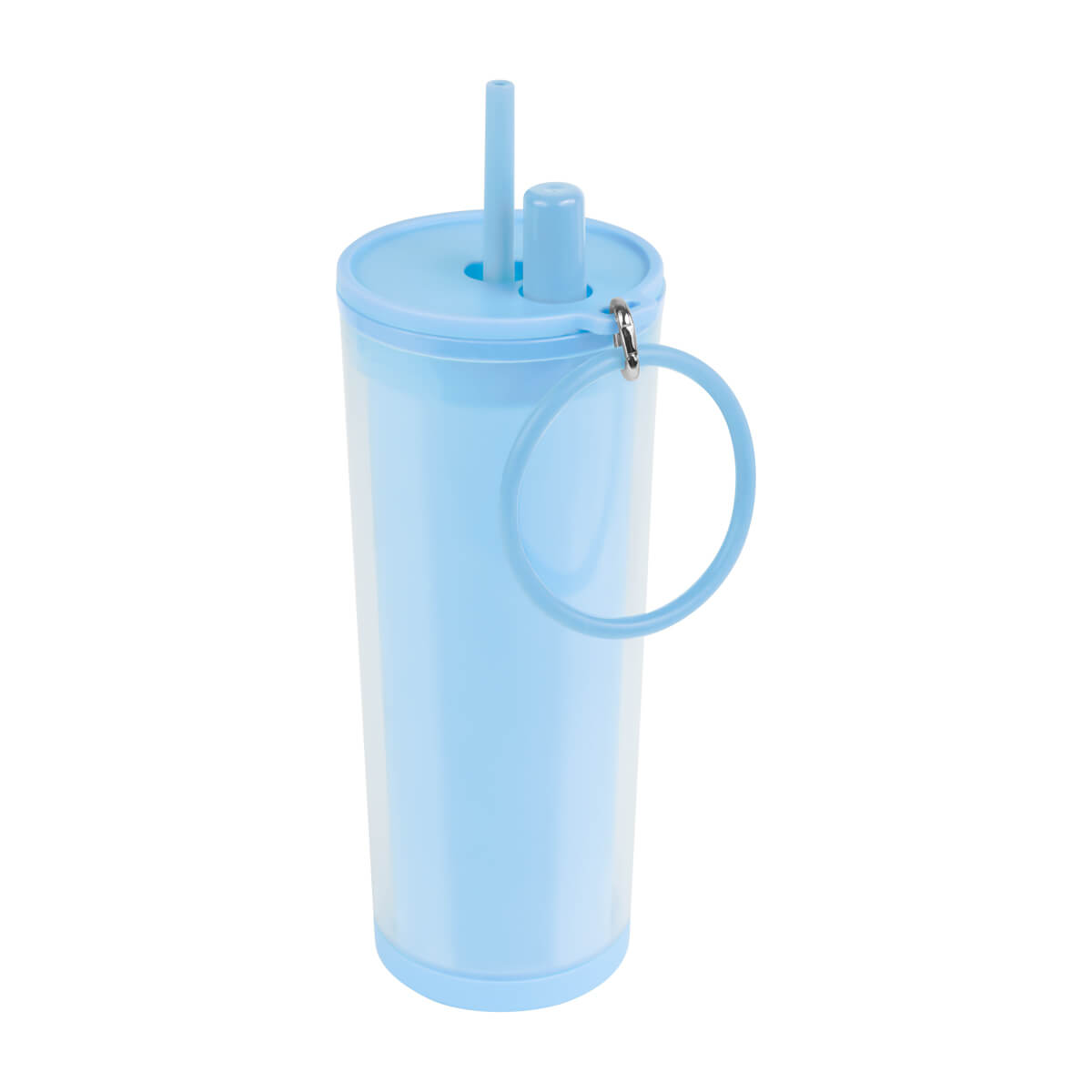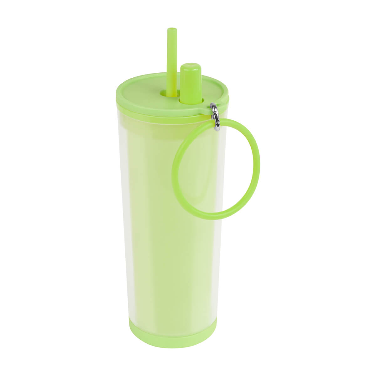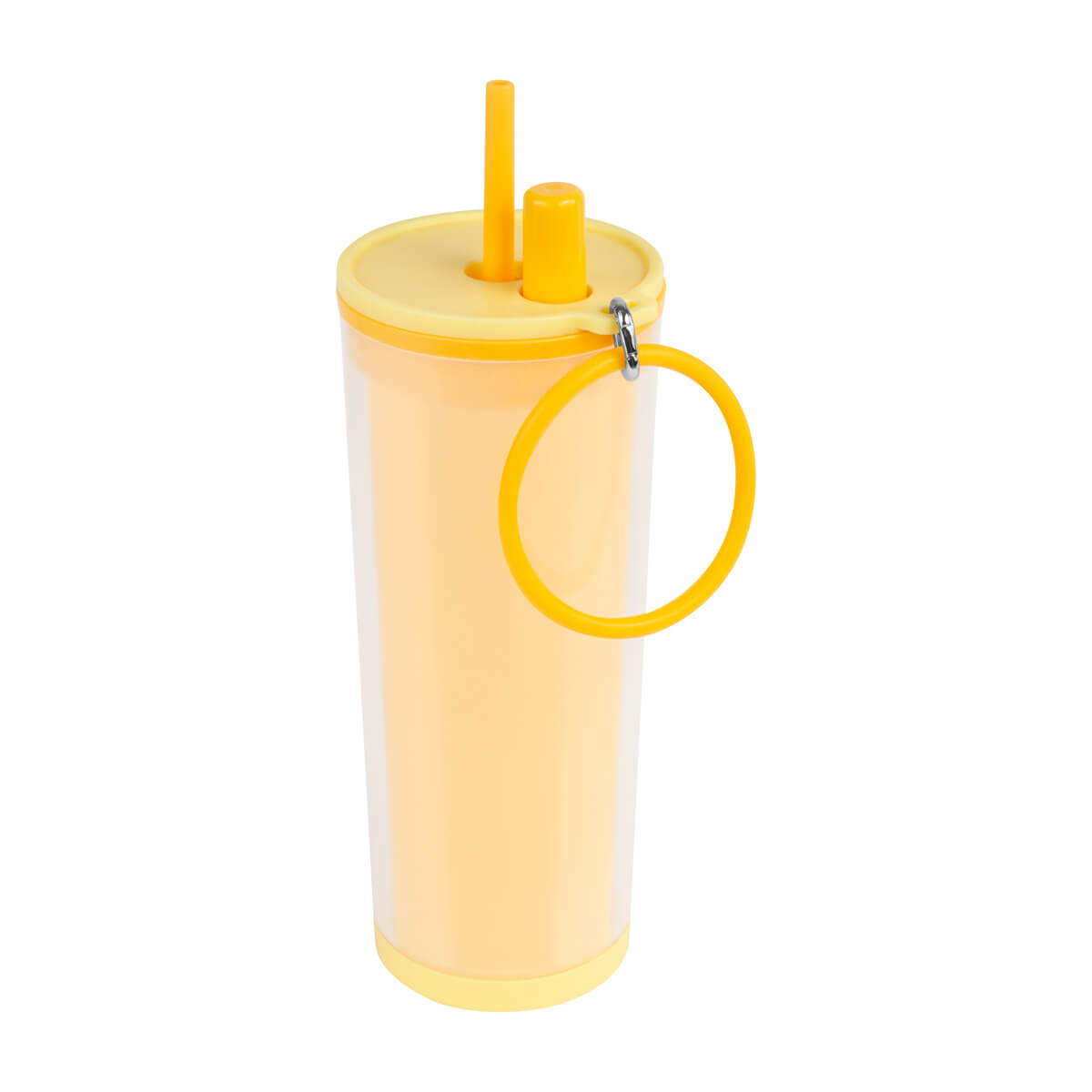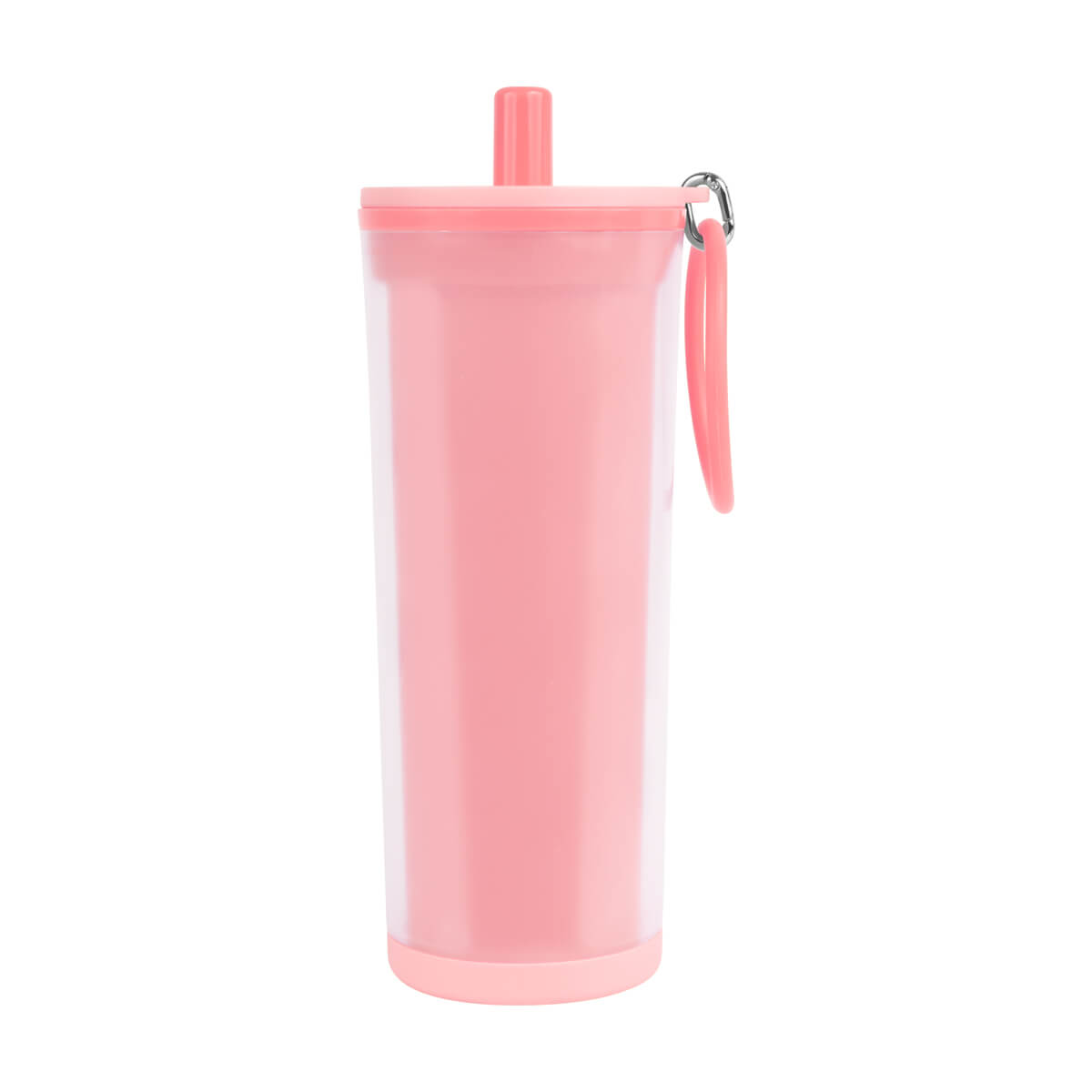TERMO HUNZA - Vaso de plástico de doble pared. Pared interna de plástico a color y externa de plástico transparente. Tapa con cierre de rosca. Incluye popote y asa con forma de aro. Capacidad 16 Oz. Incluye caja individual.