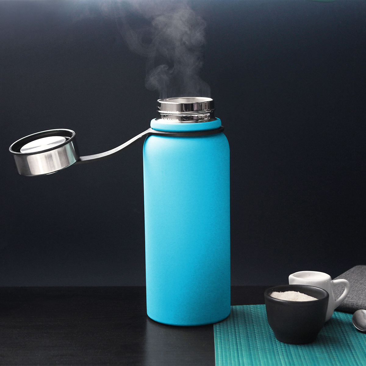 Termo Ceuta. - Termo de acero inoxidable doble pared con acabado mate, incluye rejilla metálica para té, agarradera de silicón, fabricado en materiales de grado alimenticio, mantiene bebidas frías o calientes por un largo tiempo, no usar en microondas. Capacidad de 800 ml (27 oz). Incluye caja de cartón individual.