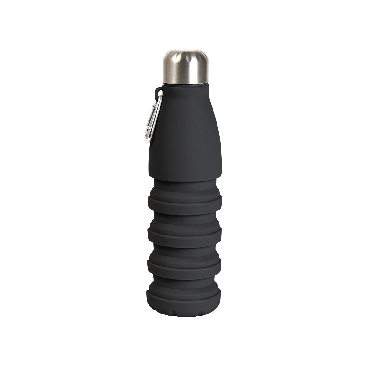 Botella Bollnas. - Botella retráctil fabricada en silicón, con capacidad de 550 ml, diseño en color sólido, tapa y arnés fabricados en acero inoxidable. Incluye mosquetón. Este termo te acompaña a donde quieras, por su gran practicidad.
