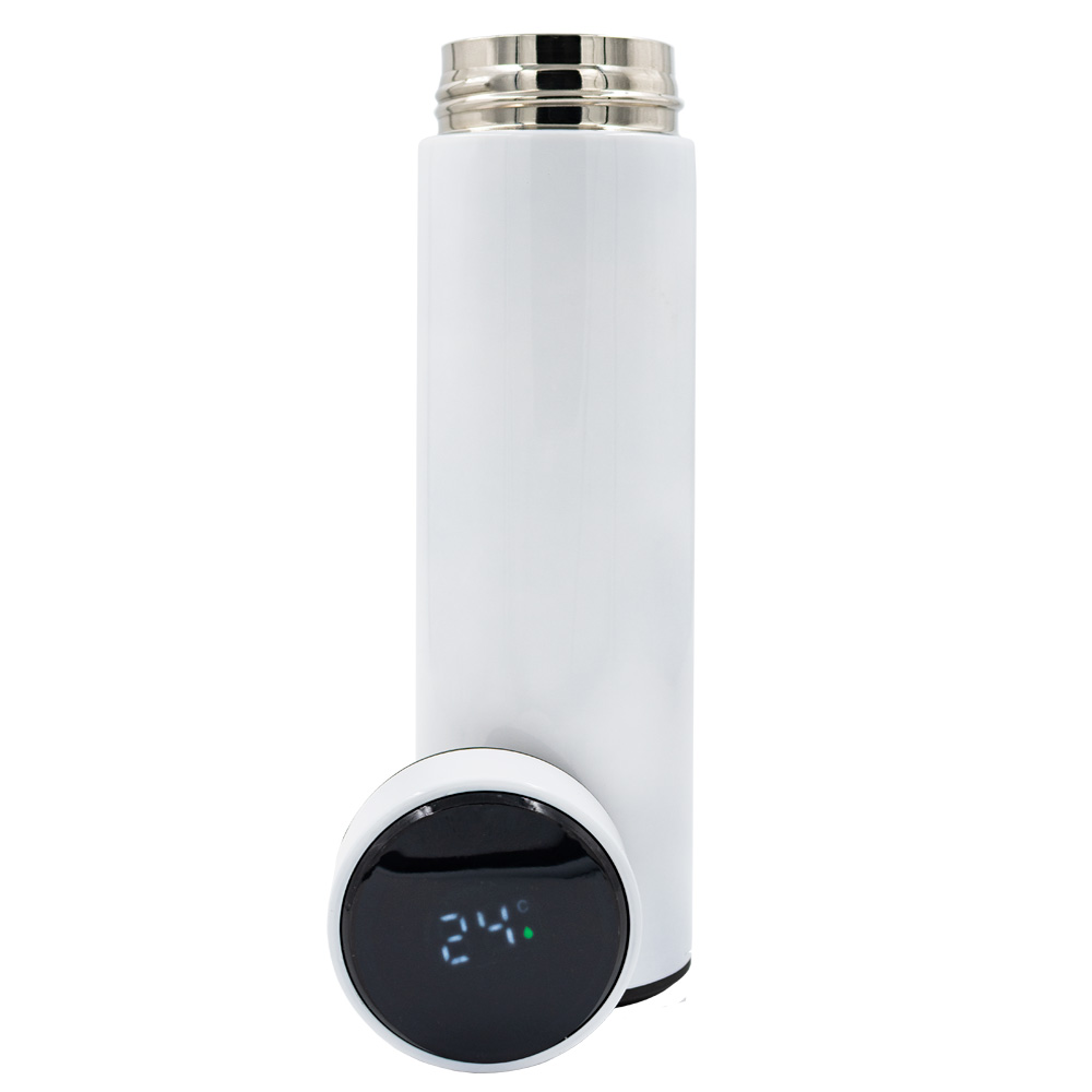 Elegante termo con capacidad de 500 ml fabricado en acero inoxidable grado alimenticio recubierto con pintura para un mejor agarre (excepto color plata). Cuenta con una pantalla digital en la tapa que muestra la temperatura real del líquido (se enciende al tocar la superficie superior de la tapa).