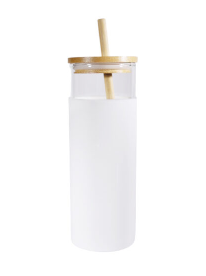 Vaso de vidrio con protector de silicona, tapa de bambú con orificio para popote.
