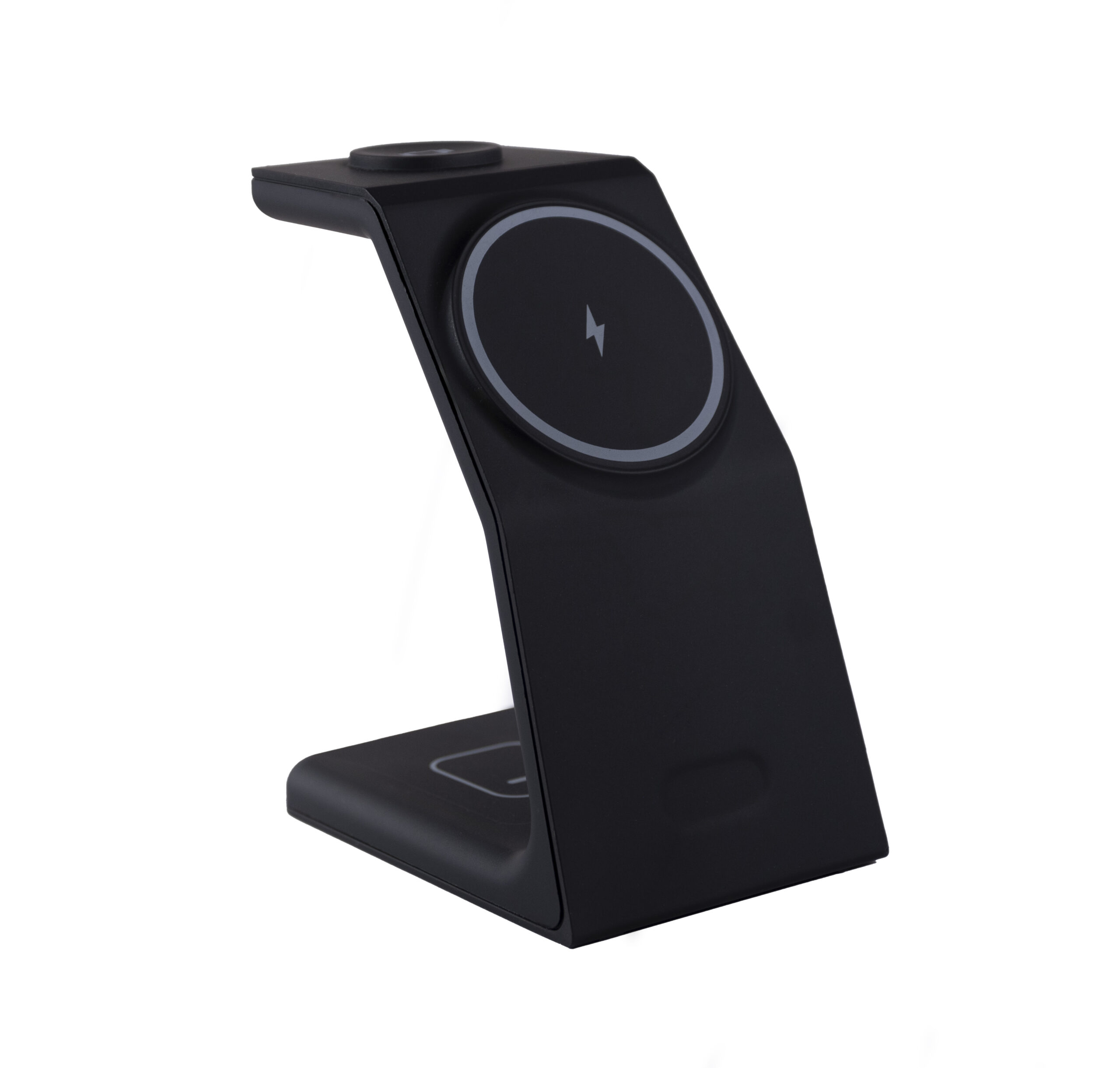 Estación de carga inalámbrica con carga simultánea para smartwatch, smartphone y auriculares en un solo dispositivo.