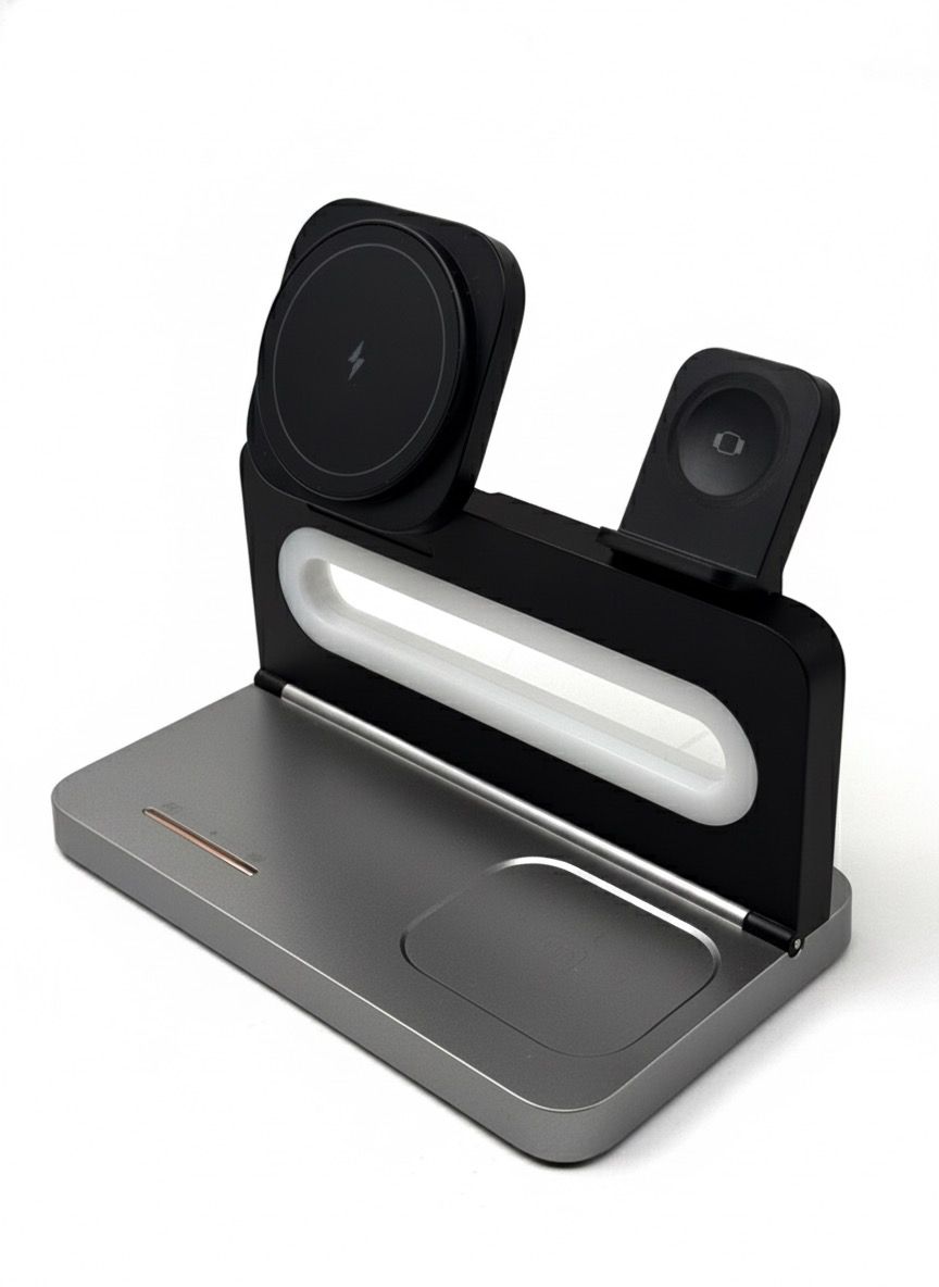 CARGADOR MAGNÉTICO 3 EN 1 Base de carga inalámbrica portátil 3 en 1 (smartphone, smartwatch y auriculares). Cuenta con iluminación LED. Incluye cable USB tipo C