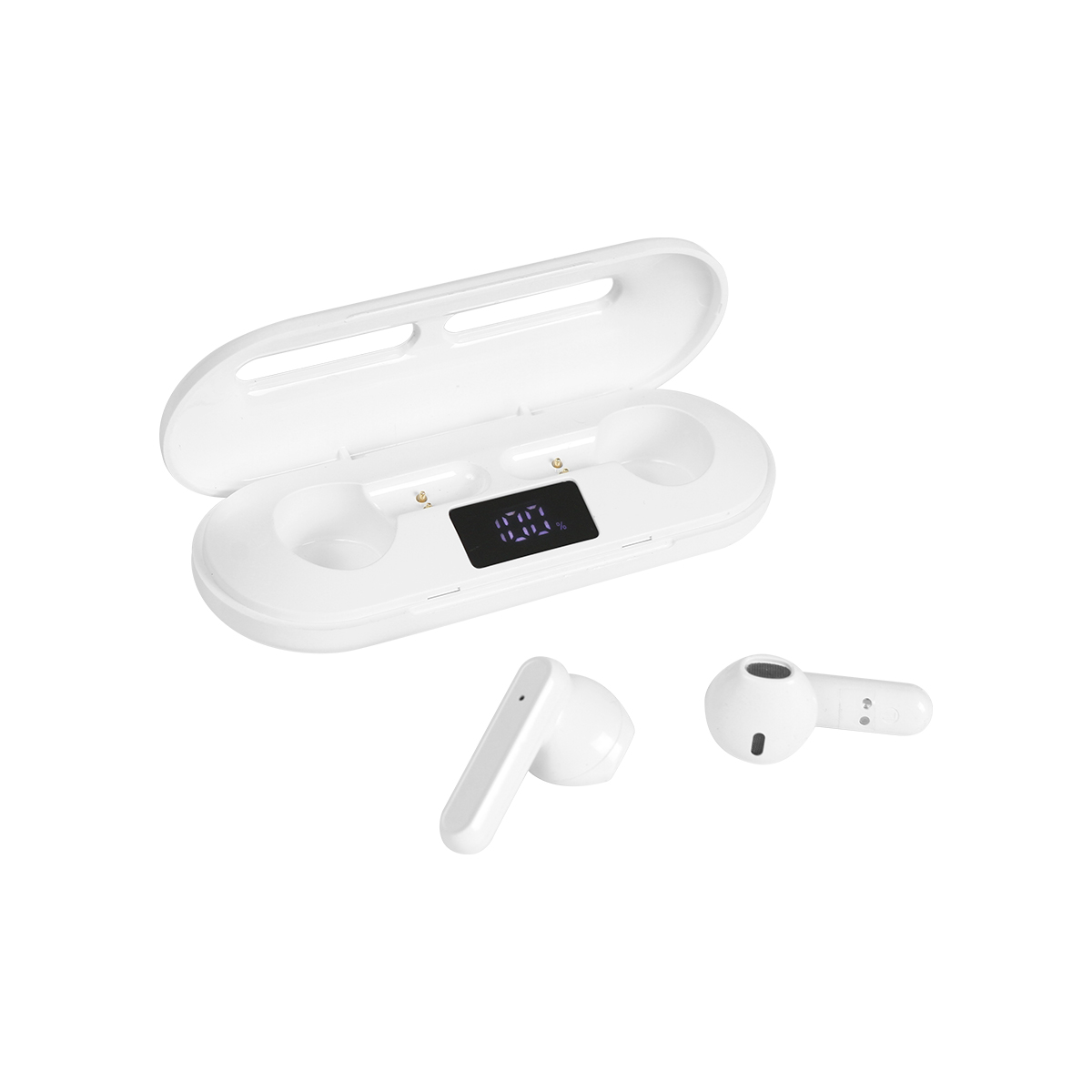 Audífonos Tulcea. - Audífonos con conexión de sonido sin cables con función touch, estuche de carga fabricado en plástico ABS, con pantalla en la parte interior donde se muestra el nivel de batería de los audífonos, tiempo de reproducción de música de 3 a 4 horas. Carga a través de cable USB (incluido). Incluye caja de cartón individual.